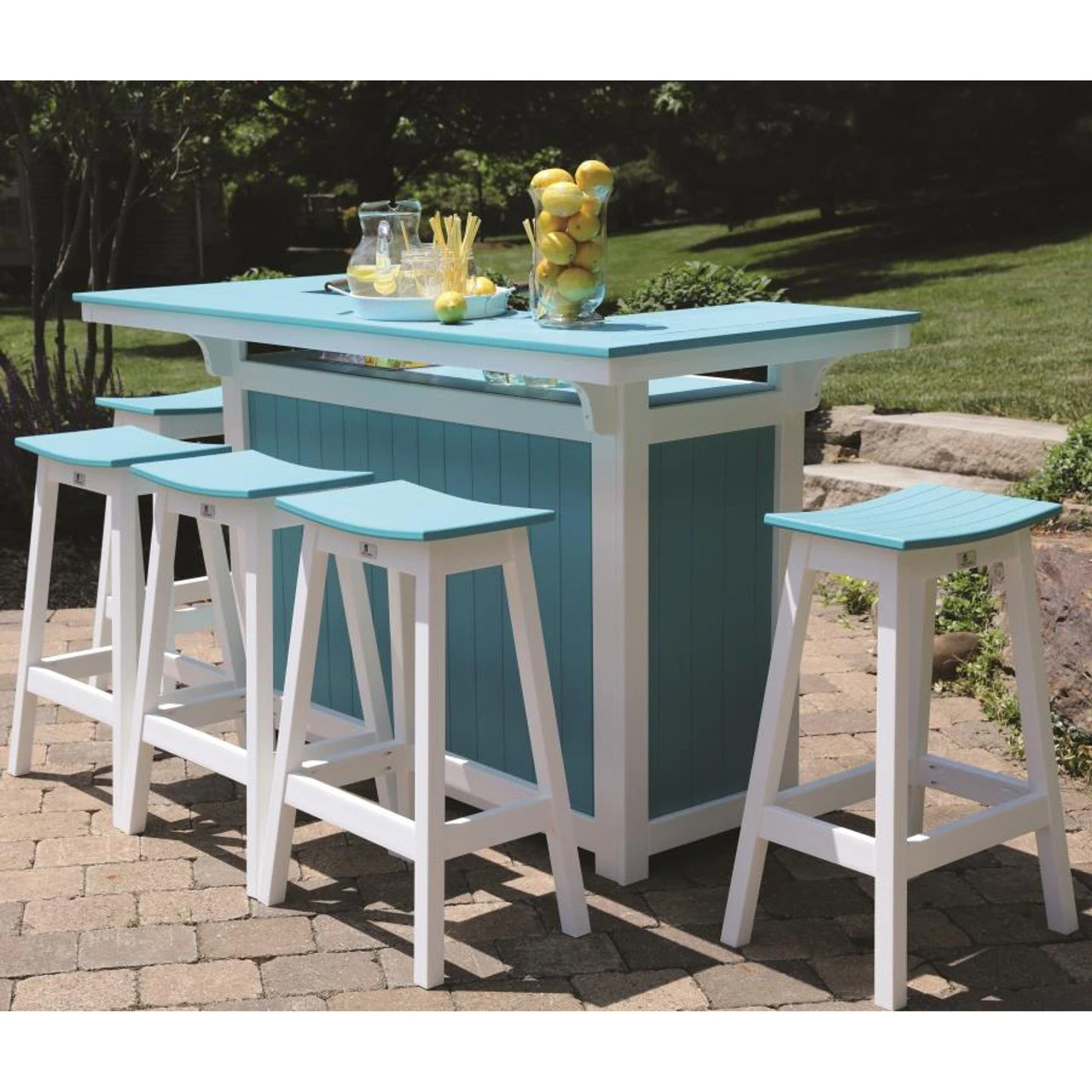 This Resin Patio Island Bar Set Includes: (6) Saddle Seat Bar Chairs, (1) Outdoor Island Bar. Above resin outdoor bar set shown in Aruba Blue on White(main image).