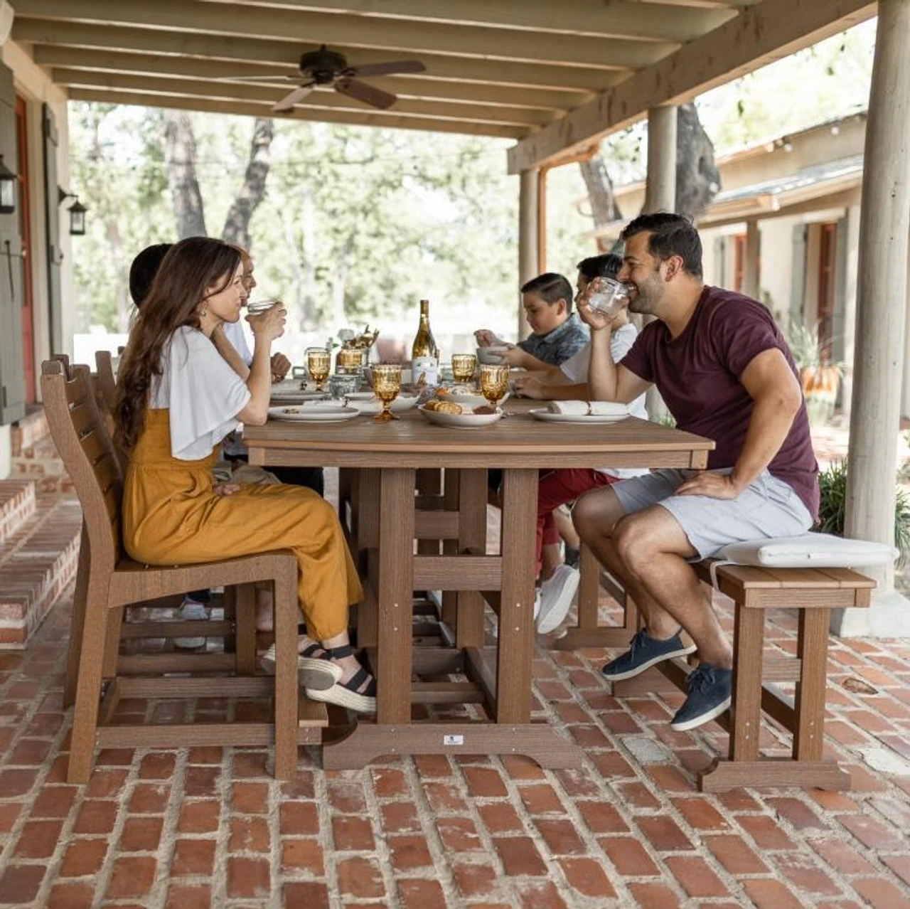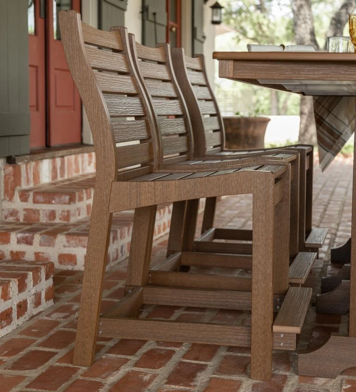 This Bristol Resin Dining Set includes: (3) Bristol Counter Height Chairs, (2) 44″ Counter Height Dining Benches and (1) 44″ x 96″ Garden Classic Rectangular Counter Height Dining Table. Shown in Antique Mahagony. Bench cushions shown in one of these images is not included with this set but can be ordered individually.