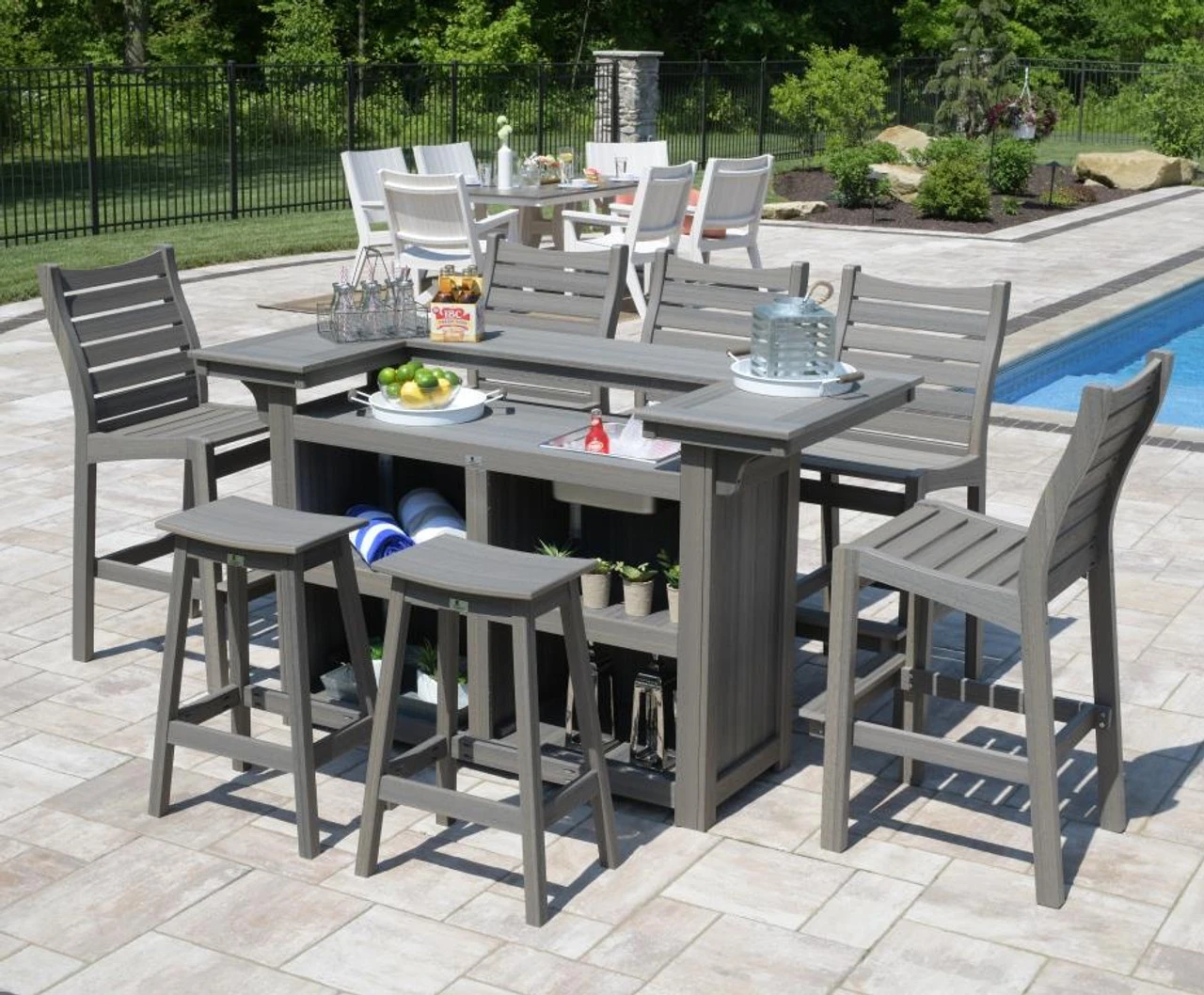 This Resin Patio Bar Set Includes: (5) Bristol XTall Bar Chairs, (2) Bristol Saddle Bar Stools, (1) Bristol Outdoor Island. Above set shown in Coastal Gray (Main image shown with optional ice bowl and cutout).