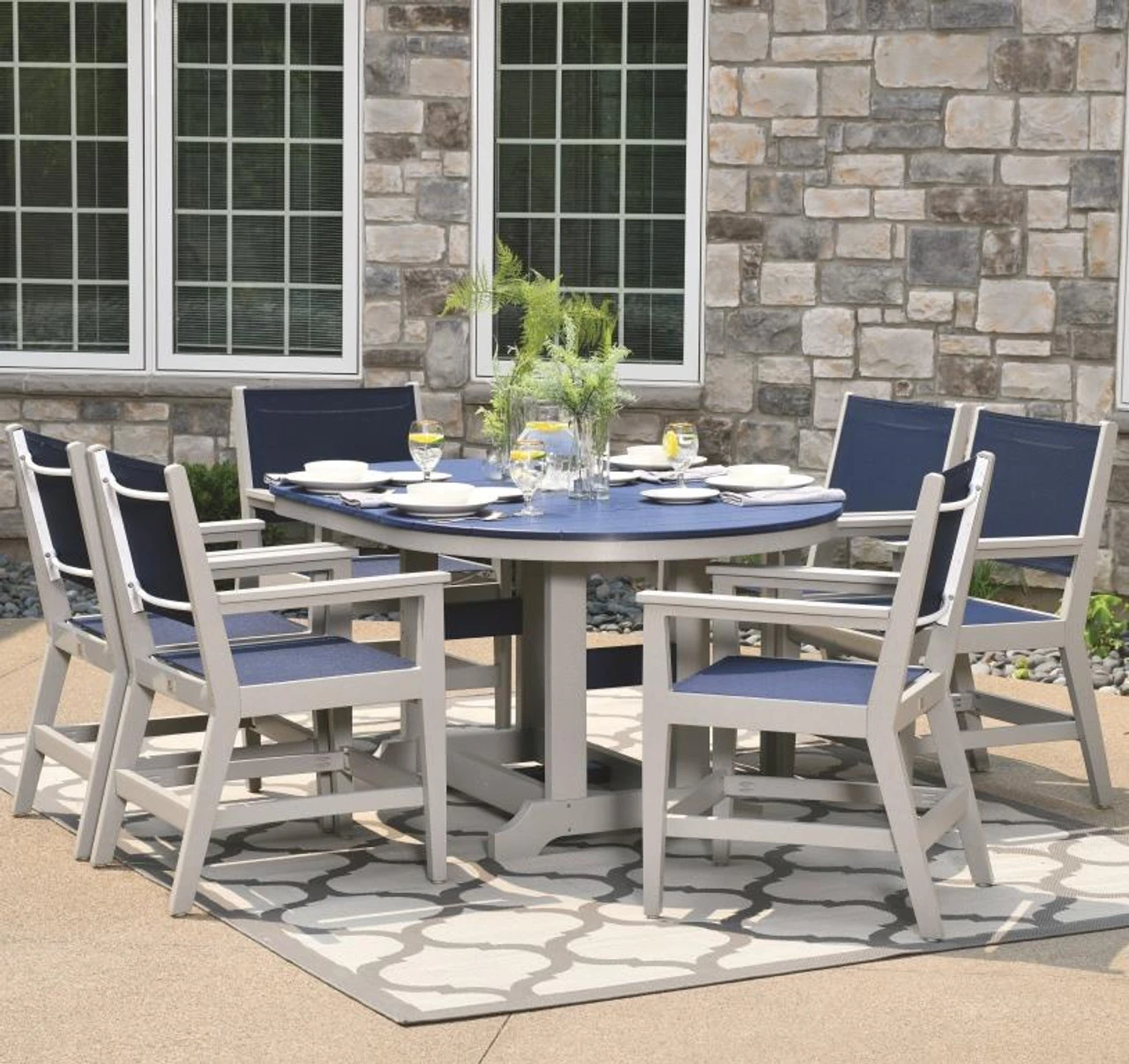 Made of weather-resistant, easy-care poly resin, this lovely set includes one 44″-wide by 64″-long by 31″-high oval table and six matching sling and poly resin dining armchairs. Choose from a full palette of wonderful color options.