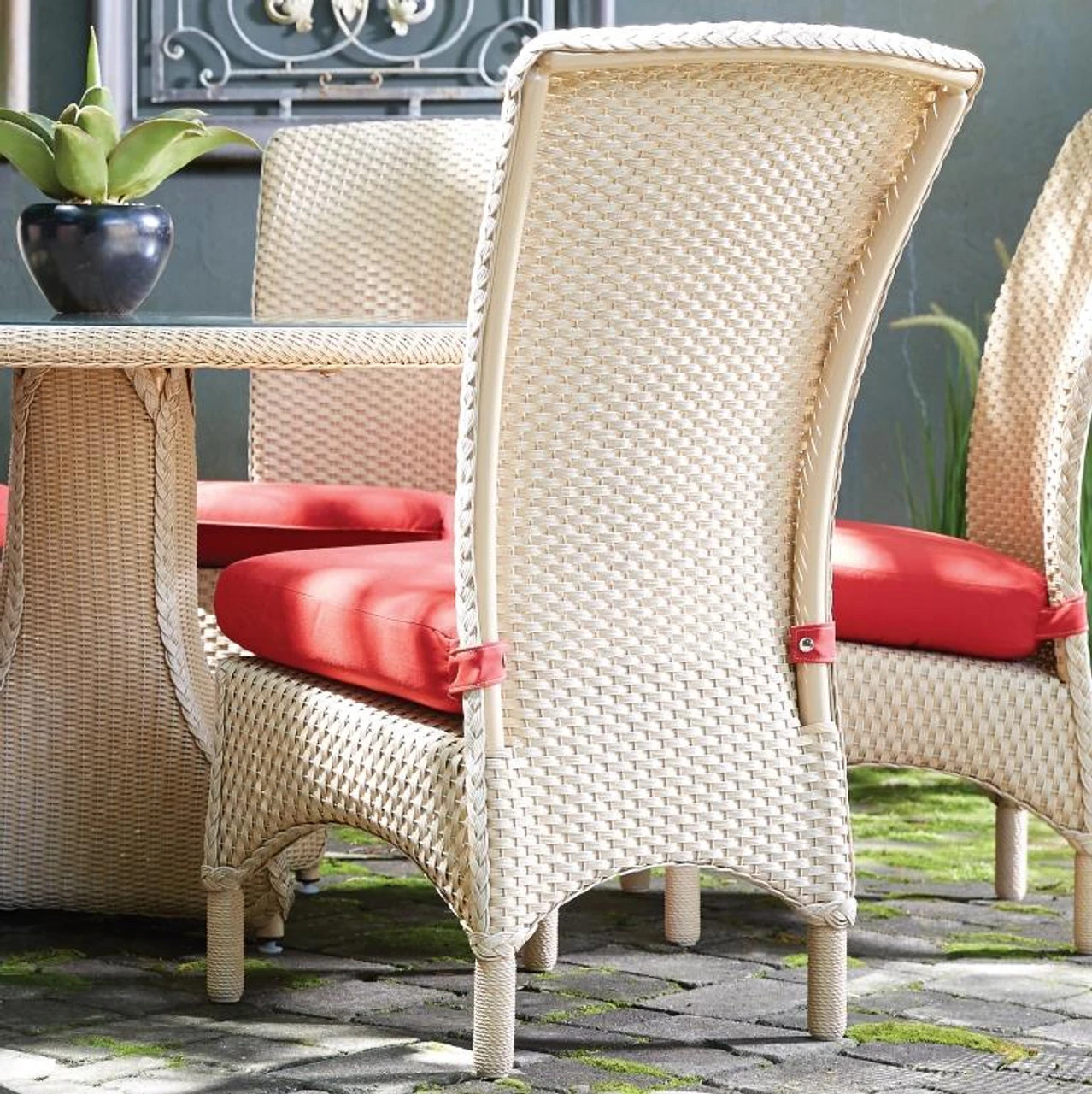 With its sophisticated apron and contoured back, the Lloyd Flanders Loom Mandalay Dining Side Chair imparts casual elegance to any meal. In other words, you’ll elevate your patio dining with this stylish patio seat from Outdoor Furniture Plus. It’s certain to last a long time thanks to a resilient aluminum frame and comfortable cushion covered in all-weather poly fabric. Select from 20 wicker colors and dozens of fabric designs to create a unique piece of outdoor furniture. All that’s missing is the perfect outdoor dining table to go with it!