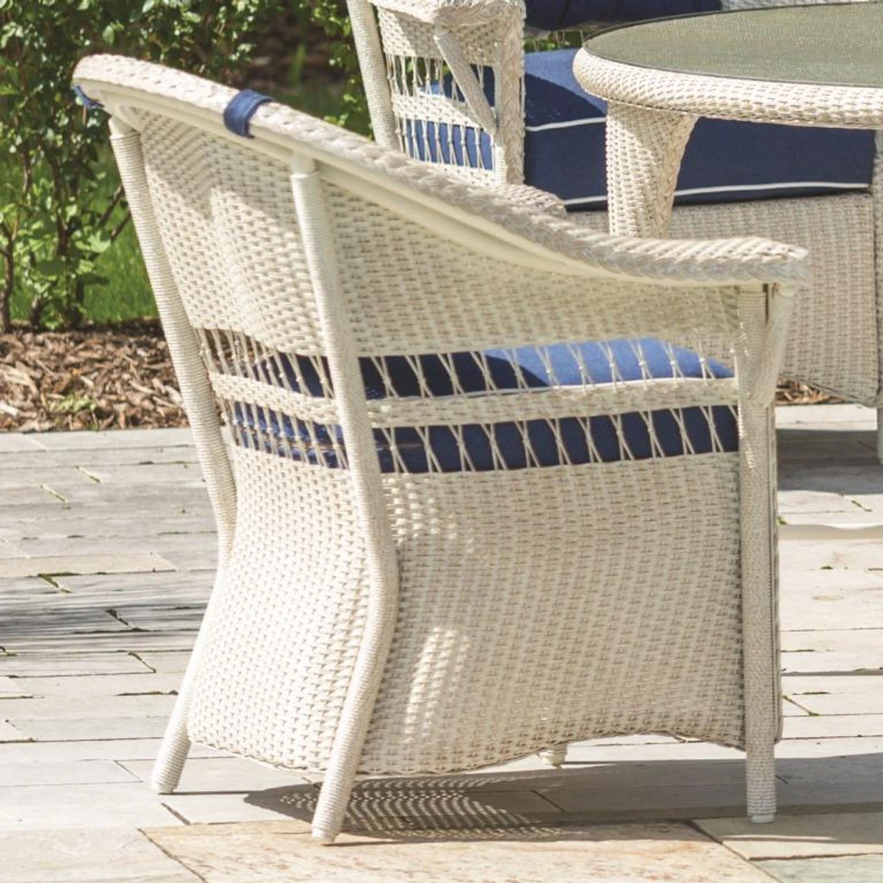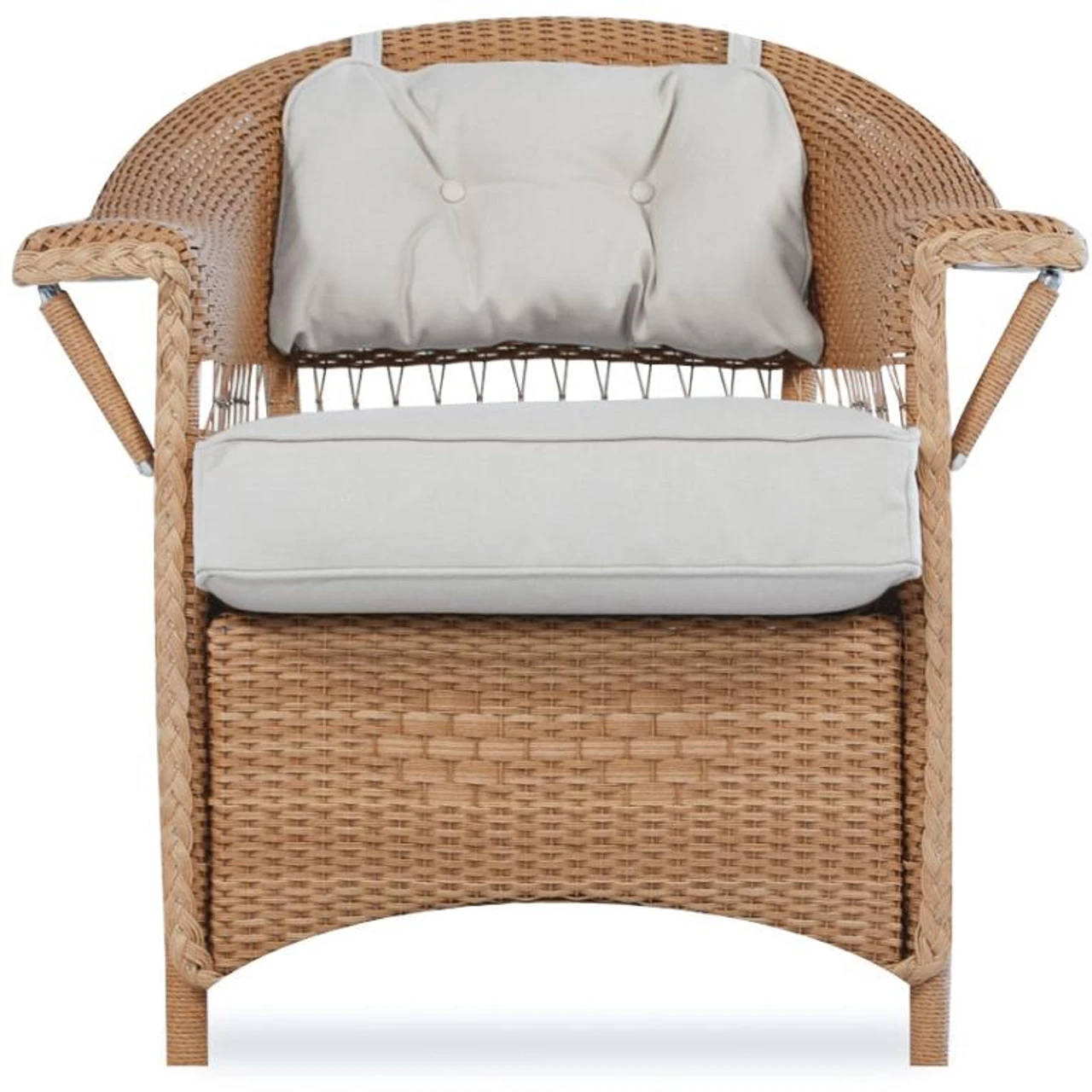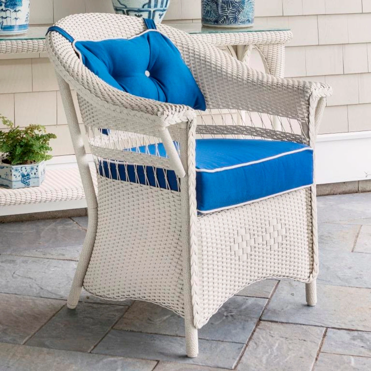 Breezy and global, the Lloyd Flanders Loom Nantucket Dining Armchair provides a go-to destination for relaxed dining. It boasts a fully welded metal frame and woven natural wicker. Choose from 20 wicker colors, from neutral to bold, as well as over 100 cushion fabric designs. This timeless patio seat from Outdoor Furniture Plus is ideal for taking it easy outside. Gently sloping armrests and an elegant apron finish the piece with plenty of charm. Add a wicker dining table to complete the scene and eat beautifully with friends and family.