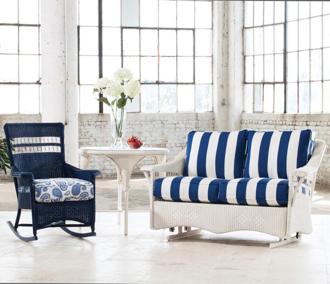 Our Lloyd Flanders Nantucket Lounge Set includes the following:Â (1) Nantucket Porch Rockers, (1) Nantucket Loveseat Glider & (1) Universal Wicker 34″ Round Bistro Table.