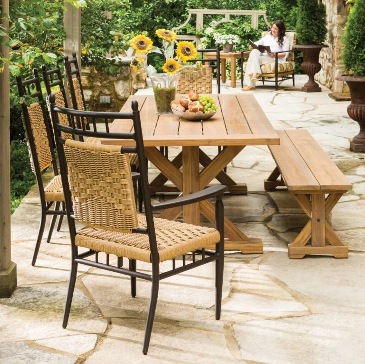 Our Lloyd Flanders Low Country Teak 8 Seat Dining Set with Bench is shown in a Natural Weave. Optional seat pads available for purchase (Available for Chairs only). Included in our set is the following: (1) Teak 87″ Trestle Dining Table, (3) Low Country Dining Side Chairs, (2) Low Country Dining Armchairs & (1) Teak 79″ Dining Bench.