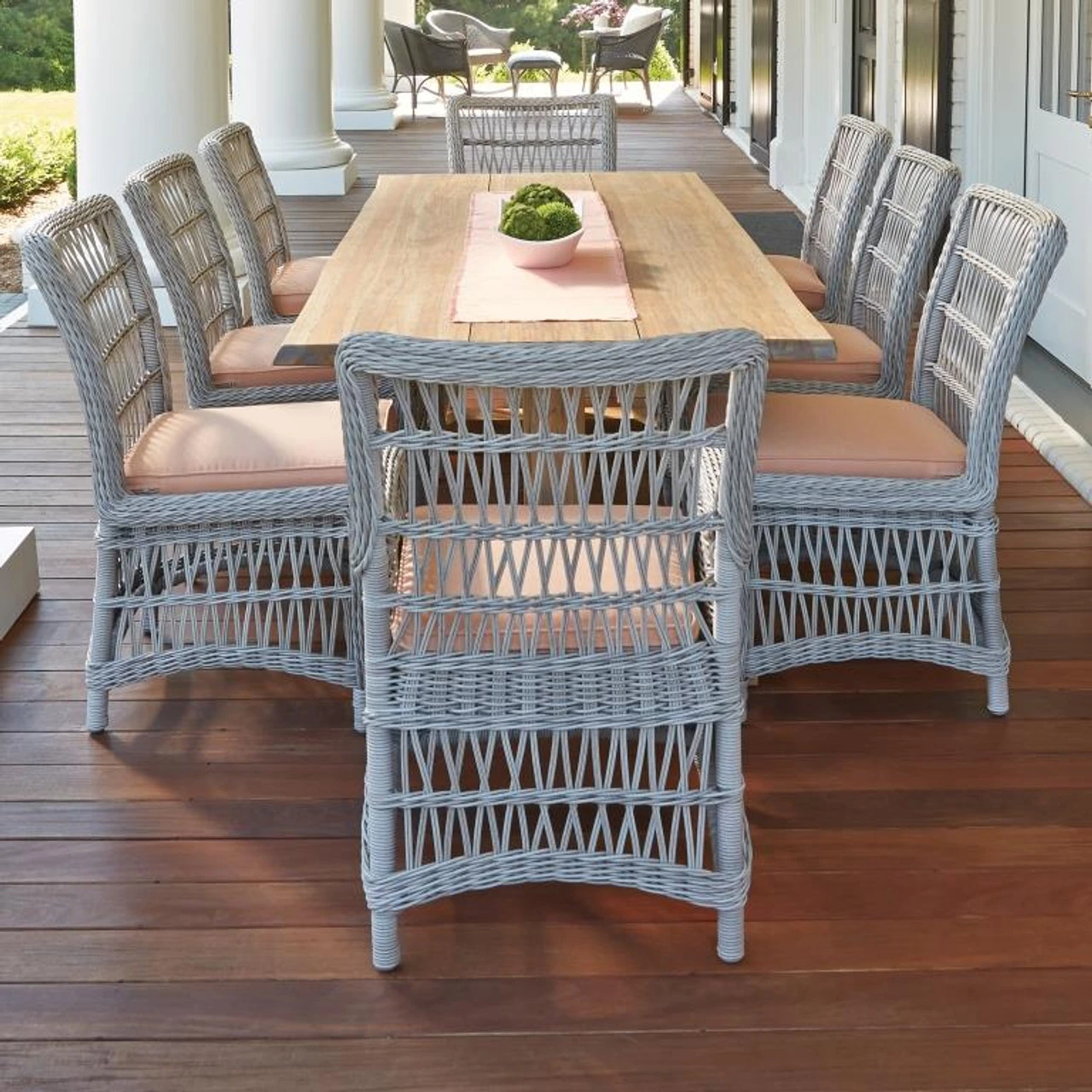 Our Mackinac Dining Set includes the follwoing: (2) Mackinac Dining Armchairs, (6) Mackinac Armless Dining Chairs & (1) Mackinac 98″ x 38″ Rectangular Live Edge Teak Table. Shown in Putty with COM Fabric (main image)