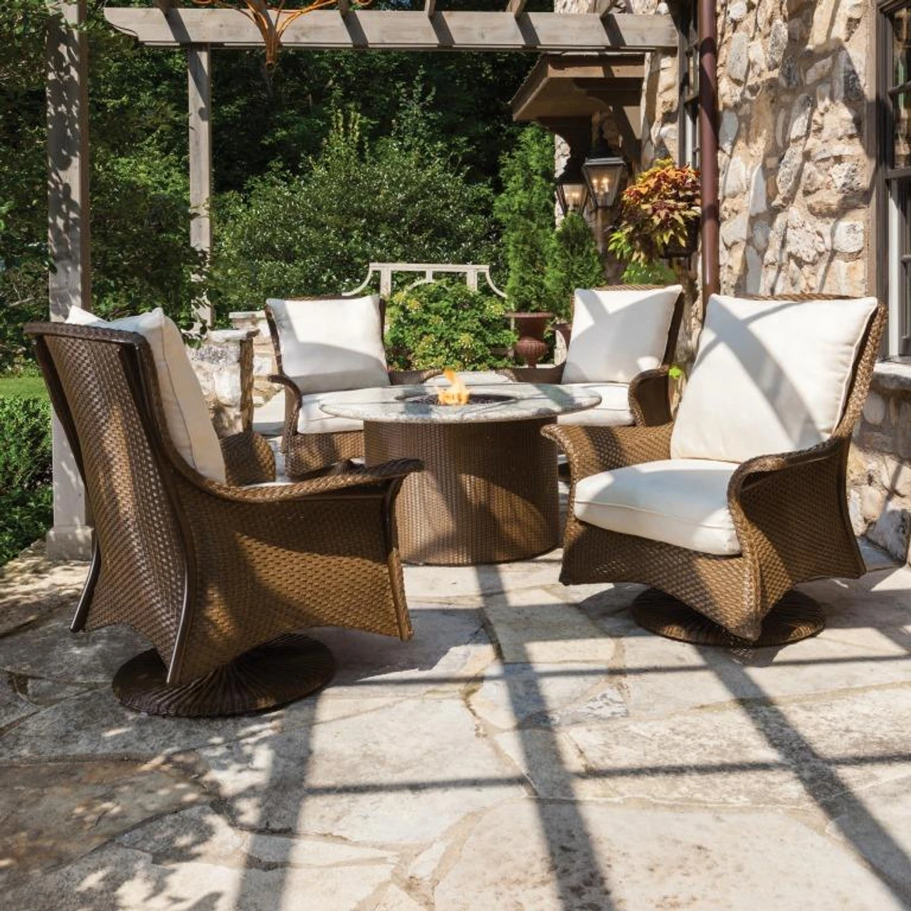 Our Lloyd Flanders Mandalay Wicker Fire Table Lounge Set includes the following:Â (4) Mandalay Swivel Rocking Lounge Chairs & (1) Fire Table with Travertine Stone Top.