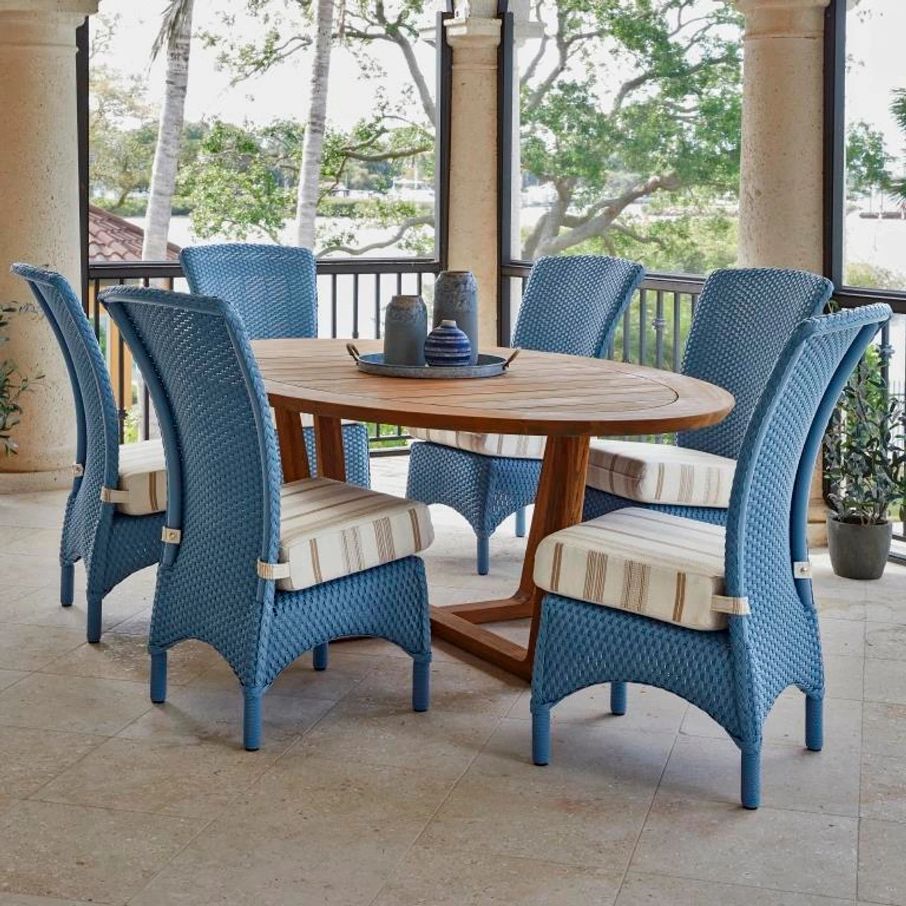 Our Lloyd Flanders Lloyd Loom Mandalay 6 Seat Dining Set comes with the following: (1) Mandalay Dining Side Chairs & (1) 84″ Oval Teak Dining Table.