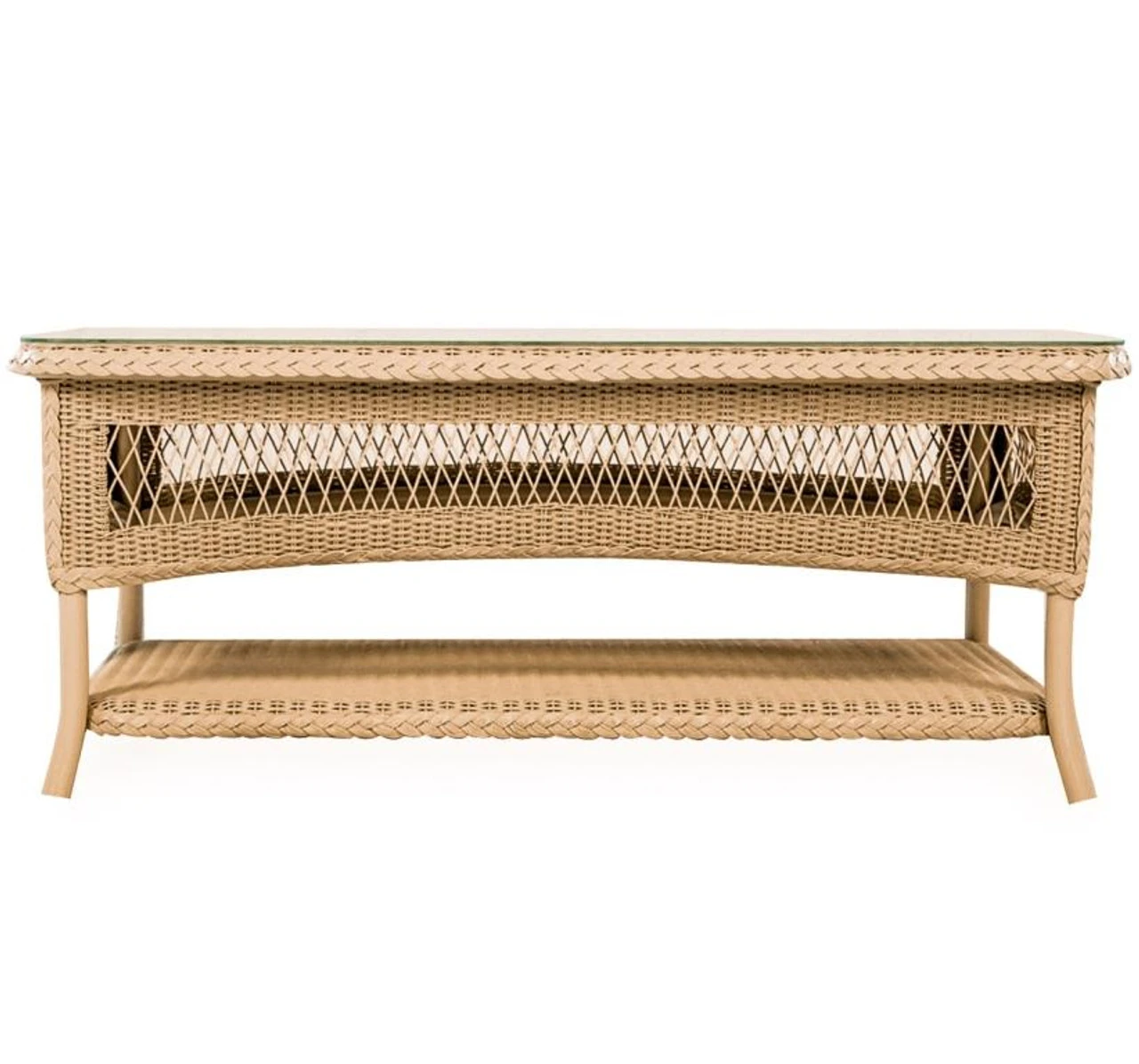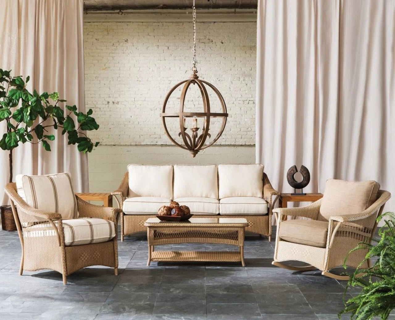 Our Lloyd Flanders Lloyd Loom Nantucket Lounge Set includes: (1) Nantucket Sofa, (1) Nantucket Lounge Chair, (1) Nantucket Lounge Rocker, (1) Universal Cocktail Table & (2) 21″ Square Teak Side Table. There are a number of side and cocktail tables made by Lloyd Flanders that can be substituted in this set. Give us a call if we can help.