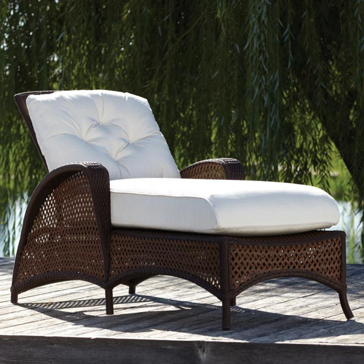 Whether you enjoy napping, reading, or tanning in the sunshine, our Lloyd Flanders Vinyl Wicker Grand Traverse Chaise Lounge Chair is the epitome of classic relaxation. This charming patio seat from Outdoor Furniture Plus features a long-lasting welded aluminum frame and UV-resistant vinyl wicker that lends a timeless quality. You’ll feel comfy thanks to its plush cushion covered in a durable, synthetic jacket. Better still? You can choose from different wicker colors and fabric hues to personalize the look. Other elegant details include a graceful apron and wide armrests for plenty of support.