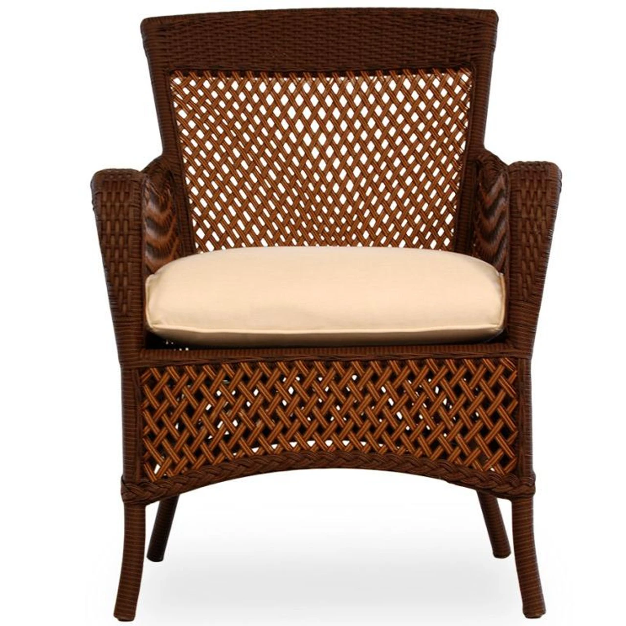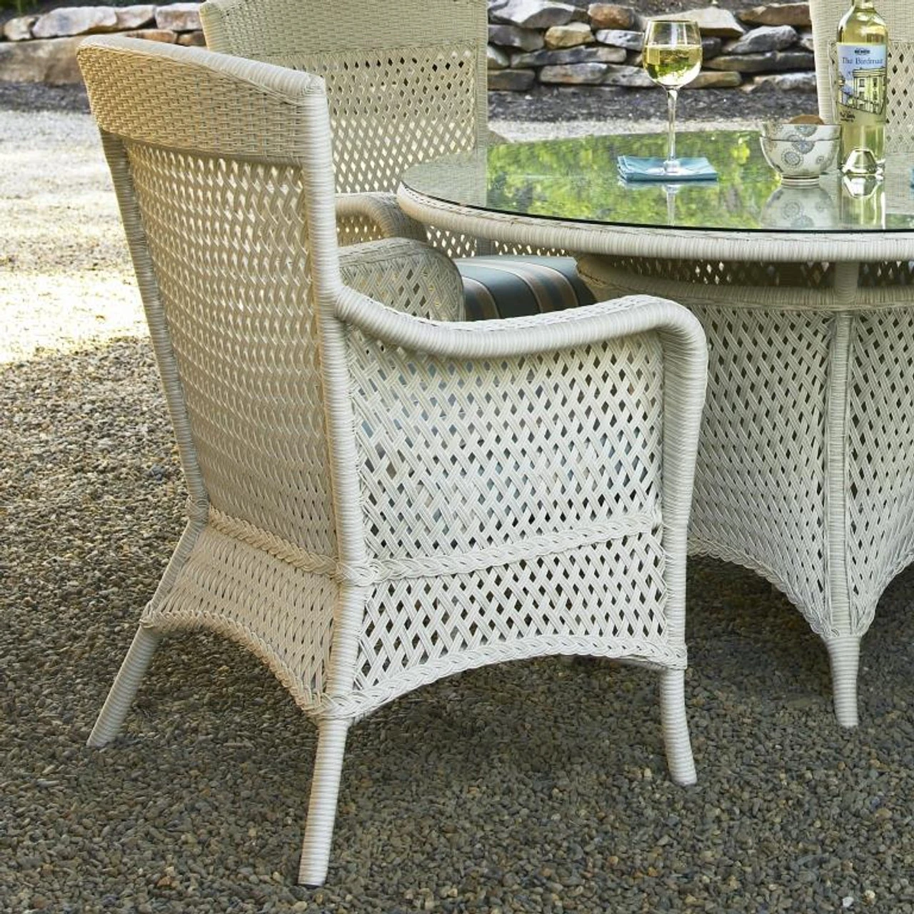 With an open weave design that’s light and inviting, our Lloyd Flanders Vinyl Wicker Grand Traverse Dining Armchair is the epitome of classic, relaxed dining. This charming outdoor seat from Outdoor Furniture Plus features an aluminum frame that’s welded for exceptional longevity and UV-resistant vinyl wicker that lends a timeless quality. You’ll feel comfy thanks to its plush cushion covered in a durable, synthetic jacket. Better still? You can choose from different wicker colors and fabric hues to personalize the look. Other elegant details include a graceful apron and wide armrests for plenty of support.