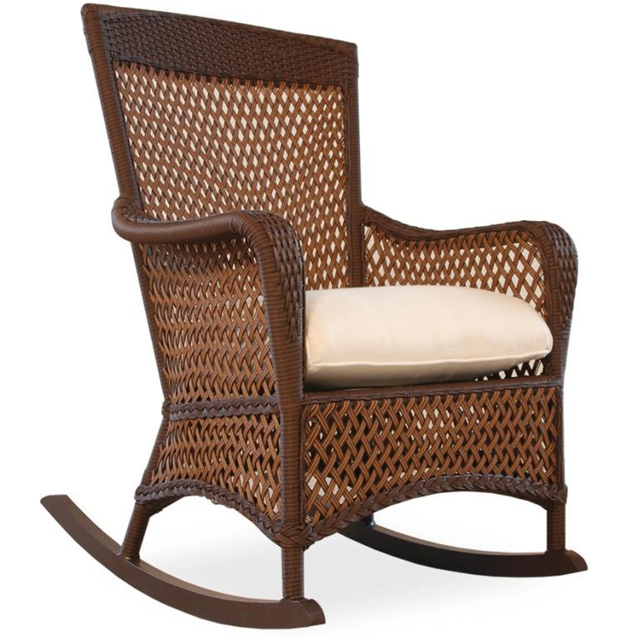 With an open weave design that’s light and inviting, our Lloyd Flanders Vinyl Wicker Grand Traverse Porch Rocker is the epitome of classic patio relaxation. This charming outdoor seat from Outdoor Furniture Plus features an aluminum frame that’s welded for exceptional longevity and UV-resistant vinyl wicker that lends a timeless quality. You’ll feel comfy thanks to its plush cushion covered in a durable, synthetic jacket. Better still? You can choose from different wicker colors and fabric hues to personalize the look. Don’t forget to pair it with a side table for a functional final touch!