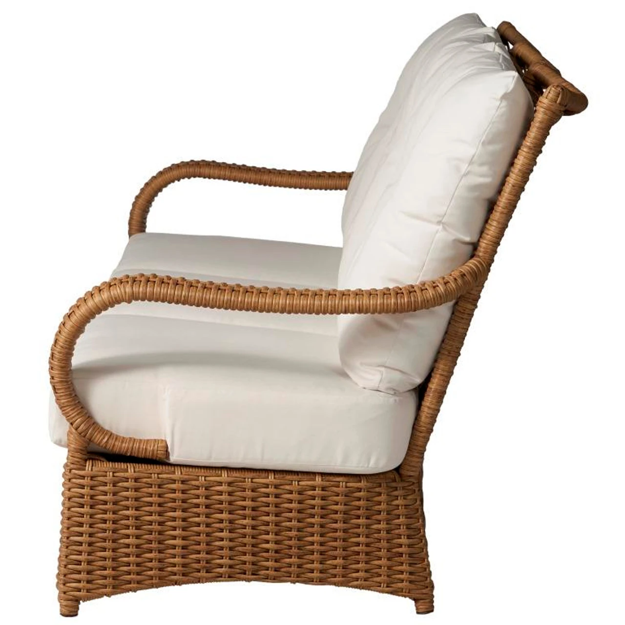 Flaunting a dignified air, the Lloyd Flanders Vinyl Wicker Magnolia Sofa delivers timeless style to any outdoor space. This beauty from Outdoor Furniture Plus boasts a scalloped apron and curvy, open arms for excellent airflow. It’s engineered with a welded aluminum frame for supreme strength and has woven vinyl wicker crafted with fade-resistant UV inhibitors. For unmatched comfort, it has value-tufted and zippered cushions covered in weather-resistant polypropylene. Try placing an outdoor planter next to it for a touch of greenery.