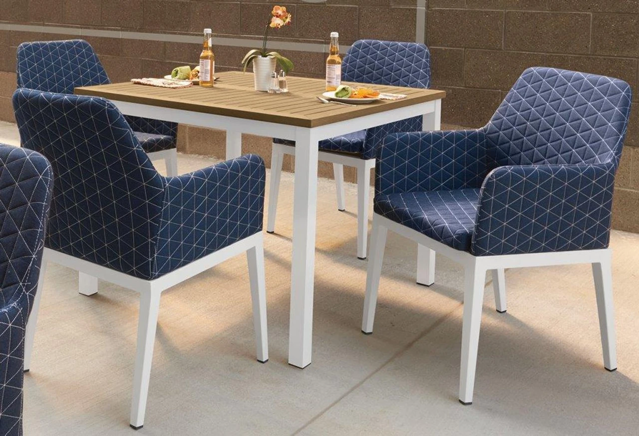 Mixing casual-contemporary and timeless touches, this patio dining set from Outdoor Furniture Plus provides the perfect spot to hang out, eat any meal, and catch up with family or friends. With chairs and a table made from powder-coated aluminum frames, the Oxford Garden Oland/Travira 4 Seat Dining Set is built to last. Its square dining table features a Tekwood top and classic, slatted design while the four lightweight quilted dining arm chairs are crafted of Sunbrella fabric for durability and comfort. Just add an umbrella and the right guests.