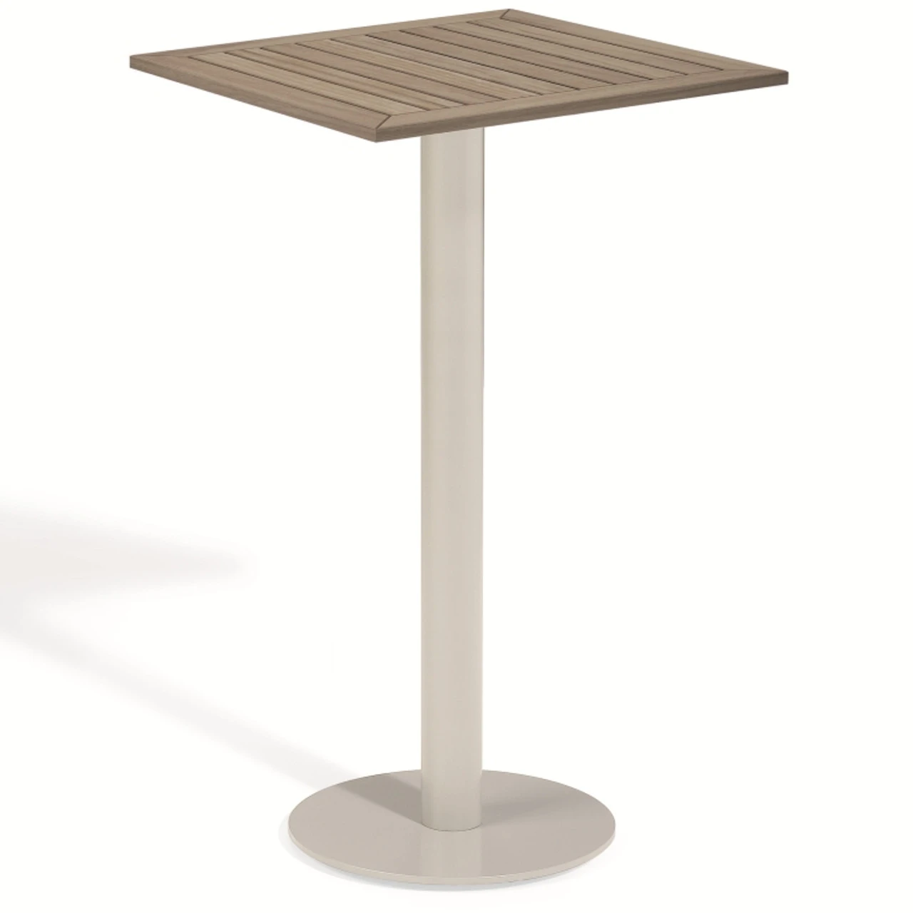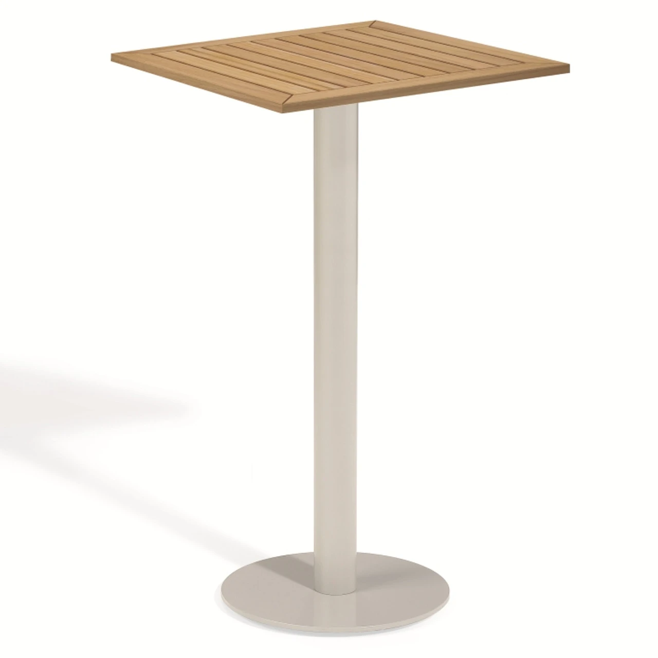 Get the versatility of tekwood in a stylish, modern design when you order this Oxford Garden Travira square bar table from Outdoor Furniture Plus. This table has a beautiful slatted tekwood top that comes in your choice of a natural or vintage finish. Each of these Oxford Garden Travira bar tables also features a durable gray aluminum base.