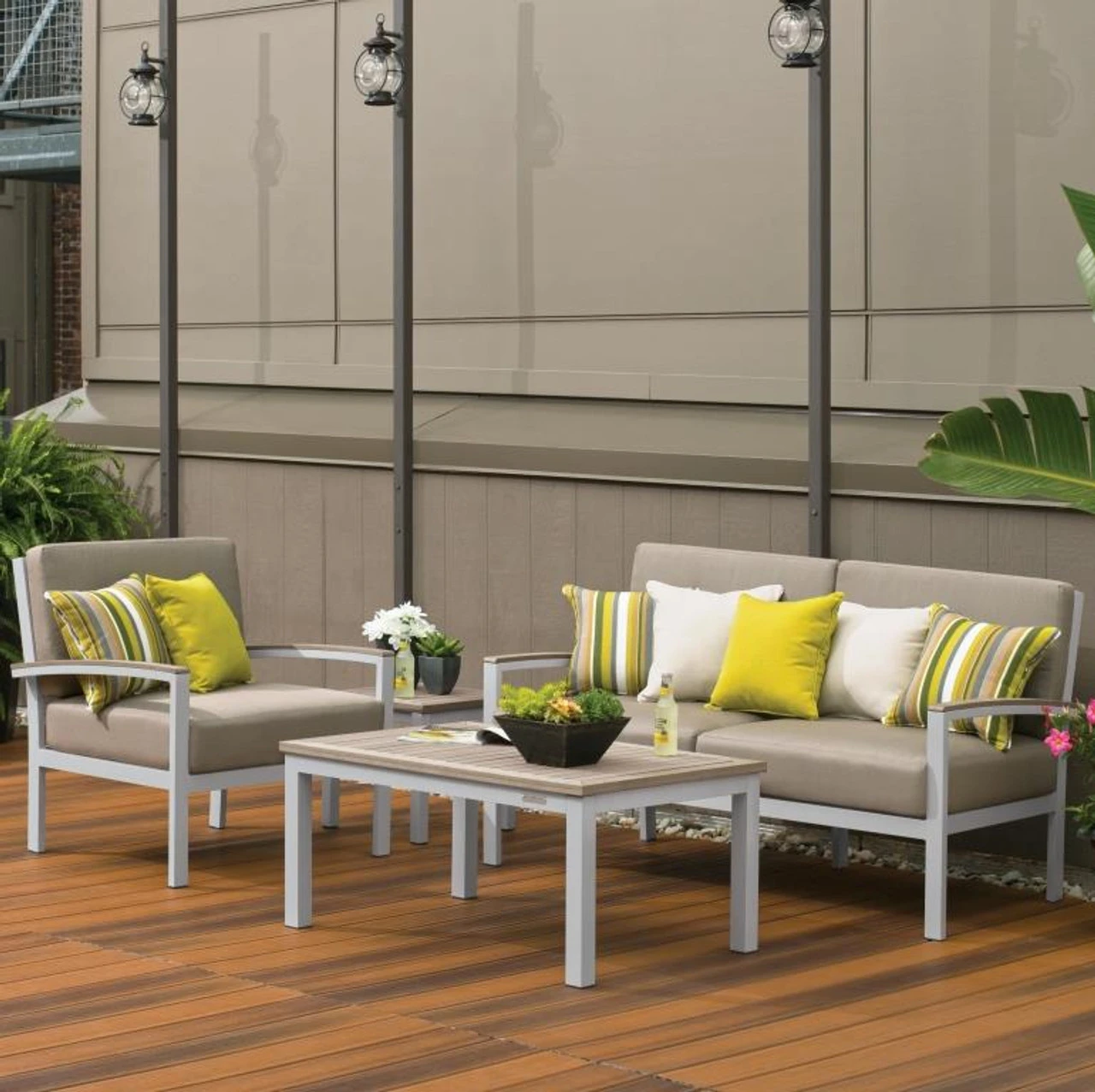 Create the outdoor entertaining space of your dreams with the striking Oxford Garden Travira Tekwood Loveseat Set. This versatile patio seating set comes with a matching loveseat, an arm chair, an end table and a coffee table for the best in al fresco lounging. All the pieces in the Travira seating set have powder-coated aluminum frames and stainless steel hardware for long-term use in the face of weather and rugged wear and tear. Tailor this Oxford Garden loveseat set to your tastes at Outdoor Furniture Plus with several fabric cushion colors and two Tekwood finishes.