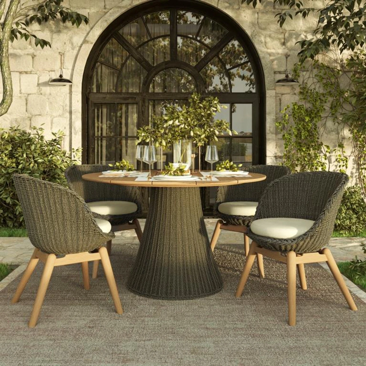 Our Oxford Garden Tulle Dining Set Includes: (4) Tulle Wicker Dining Chairs & (1) 48″ Round Tulle Wicker & Teak Dining Table