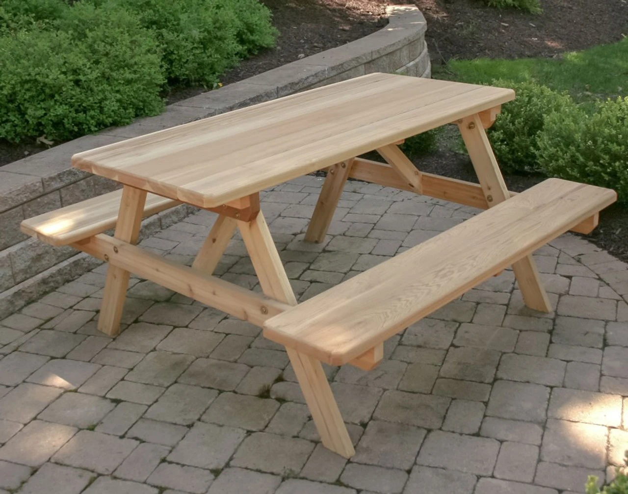 The Cedar Wood Park-Style Picnic Table with Attached Benches from Outdoor Furniture Plus gives you just about everything you need for a fun day in the sun. Just add folks, food and beverages and youre good to go. This handy, handsome set is available in 4, 5, 6 and 7 sizes, giving you the latitude to suit just about any space and number of diners. Its available unfinished or stained and sealed.