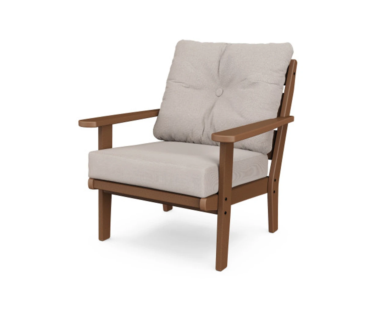 Eco-friendly and long-lasting, the POLYWOOD® Lakeside Deep Seating Chair is crafted with sustainability in mind. That and wonderful times spent with friends and loved ones! This comfortable patio seat from Outdoor Furniture Plus boasts a frame made of 90% recycled material in the USA. It can handle any weather and includes stylish details like tapered legs, slender armrests, and marine grade stainless steel hardware. Plus, it has a plump, value-tufted cushion in several cozy color options. Simply find the perfect occasional tables to mix with it!