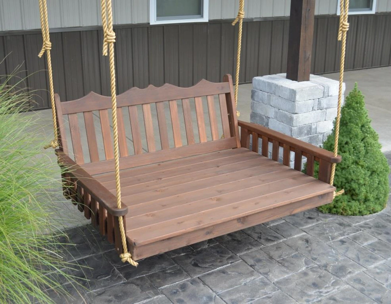 The Royal Cedar Wood English Garden Swing Bed from Outdoor Furniture Plus provides a perfect place to relax on a warm summers day or eve. Its made of natural cedar hand-selected by Amish craftsmen for looks and strength, so you can count on durability and beauty. Available in 4, 5 or 6 sizes, this outdoor patio swing bed will become the most popular place on your porch or anywhere else you put it. For an extra cost, you can order it with one of many appealing stains and get extra cushions of varying thickness in the color of your choice. Optional Hanging Kit may be added above: (2) Swivel Hanging Hooks & (4) Heavy Duty 4″ Lag Screws.