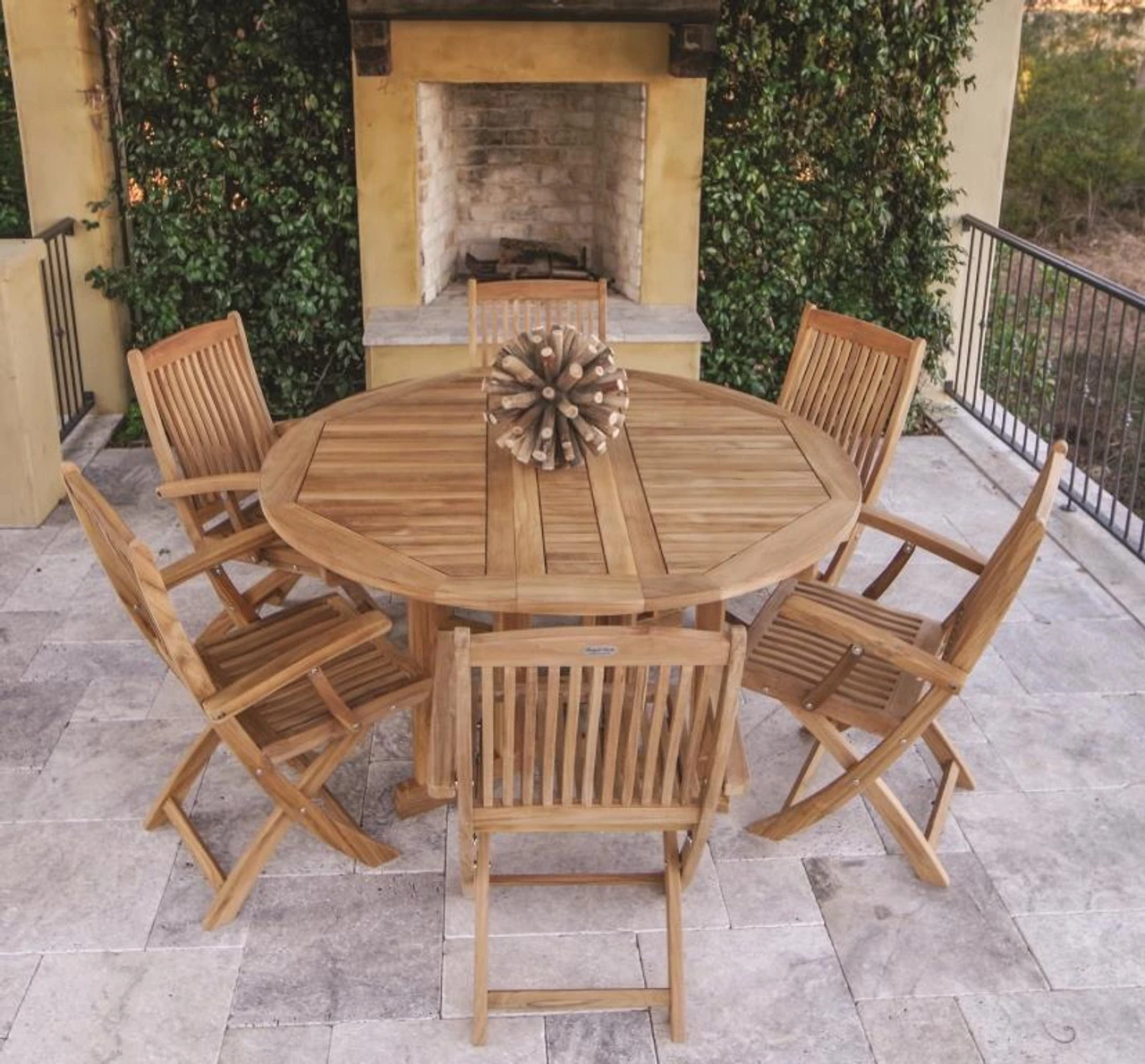 Set includes: (1) 60″ Teak Round Drop Leaf Table with (6) Teak Sailor Folding Arm Chairs