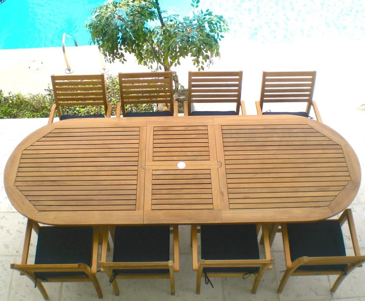 Besides its rich, luxurious look, the Royal Teak 96-120 Oval Family Expansion Table and Eight Avant Chairs Dining Set from Outdoor Furniture Plus has its sensible side. You can easily adjust the beautiful teak tables length from 8 feet to 10 feet to accommodate different numbers of diners. This set includes eight handsome armchairs made of grade A teak. Optional cushions are available to provide even more seating comfort.