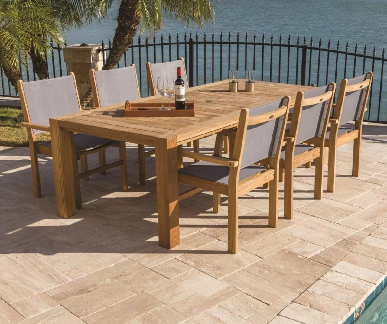 Just like the fabulous Florida island its named for, the Royal Teak Dining Set with Table and Six Captiva Sling Chairs from Outdoor Furniture Plus will provide many memorable days in the sun. This captivating set combines teak woods natural beauty with its famous durability. It includes one 96 x 44 x 29 1/2 table and six matching armchairs. A variety of beautiful colors are available for the chairs vinyl-covered slings. You can order two extra dining chairs with our dropdown menu as well.