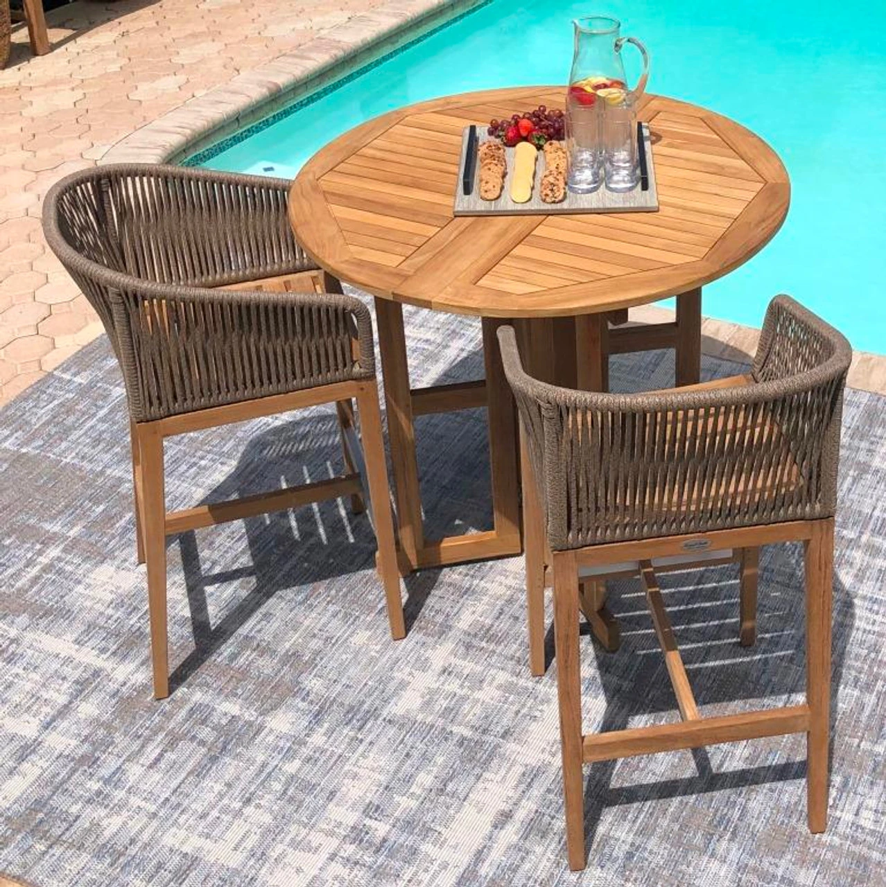 Instantly create a cozy atmosphere with the Royal Teak Malibu 3 Piece Round Drop-Leaf Bar Height Set. Featuring lots of curves and clean lines, it mixes geometric beauty with global appeal. The distinct look of this set from Outdoor Furniture Plus comes from its chairs single-piece gently sloping back and arms, which feature linear spun resin-nylon rope on a wicker frame. The table is crafted of all-weather teak and is perfect for smaller spaces courtesy of its drop-leaf design. Why not add an outdoor umbrella to finish the scene?