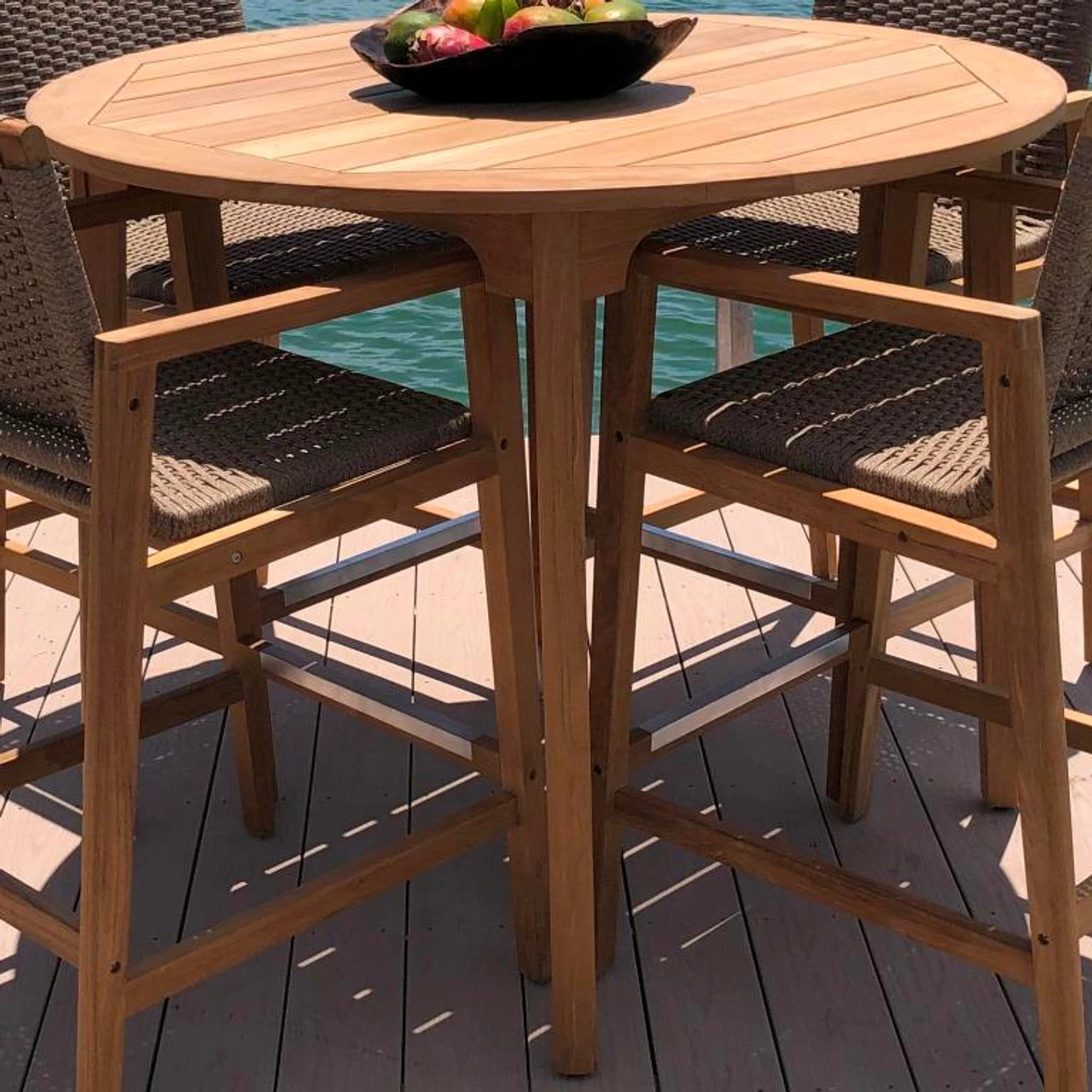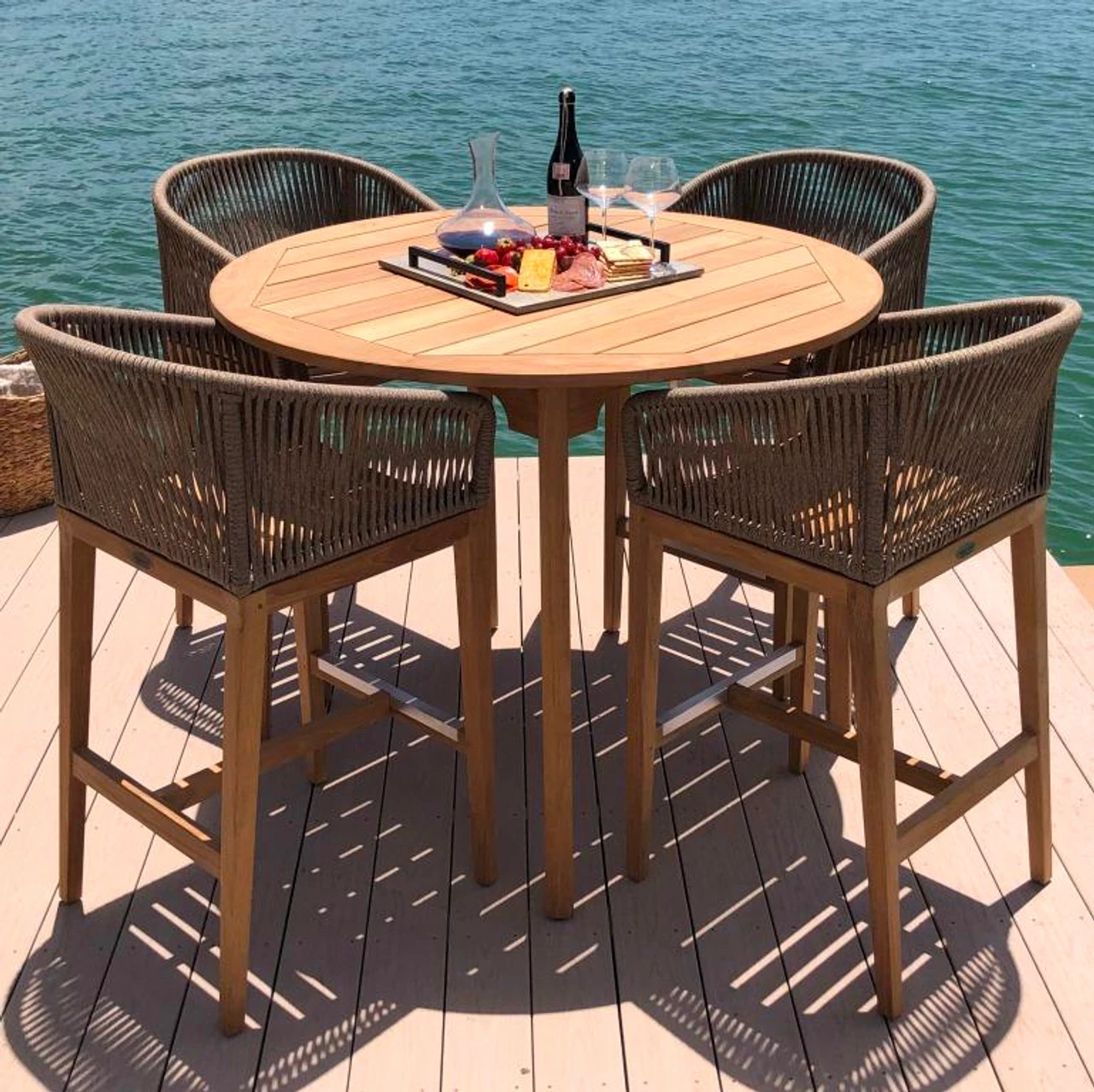 With so many curves and clean lines, the Royal Teak Malibu 5 Piece Round Bar Height Set mixes geometric beauty to its natural, global appeal. The distinct look of this set from Outdoor Furniture Plus comes from its chairs single-piece gently sloping back and arms, which feature linear spun resin-nylon rope on a wicker frame. The table is crafted of smooth, all-weather teak with a planked top and simple silhouette, lending timeless charm to your al fresco space. Add a fire pit nearby for those cold nights!