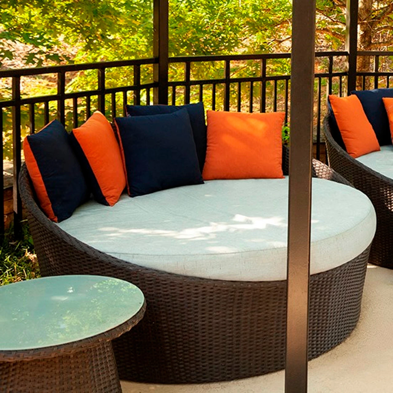 Our Moon Daybed comes standard with a standard cream colored outdoor cushion. Custom Sunbrella Options can be selected. Expect a lead time of 6 Weeks if adding custom cushions.