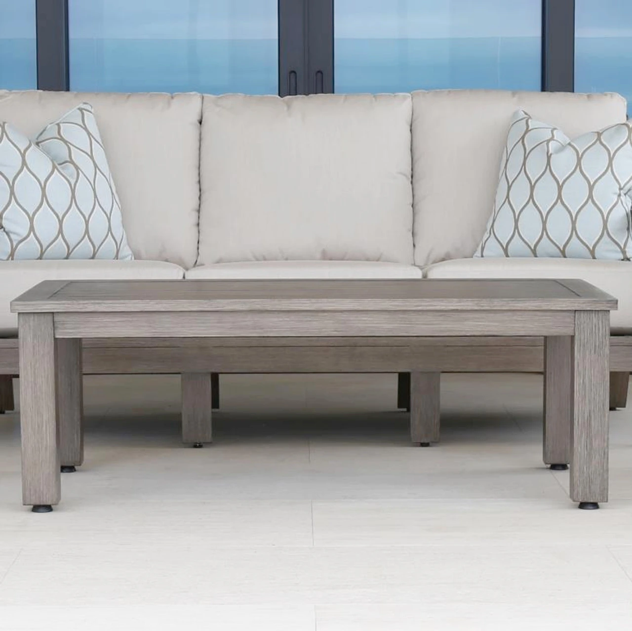 Inspired by the classic Parsons table, our Sunset West Laguna 54″ Rectangular Coffee Table flaunts clean lines and a sturdy construction. This modern table from Outdoor Furniture Plus offers an ideal place to showcase decor and set food and drinks. It boasts a fully welded aluminum frame and a hand-brushed, scratch-resistant finish. Perfect if you have kids or pets! Our stylish patio table delivers amazing functionality to your outdoor living area and plays nicely with bold patio furniture. Shown in Driftwood Finish.