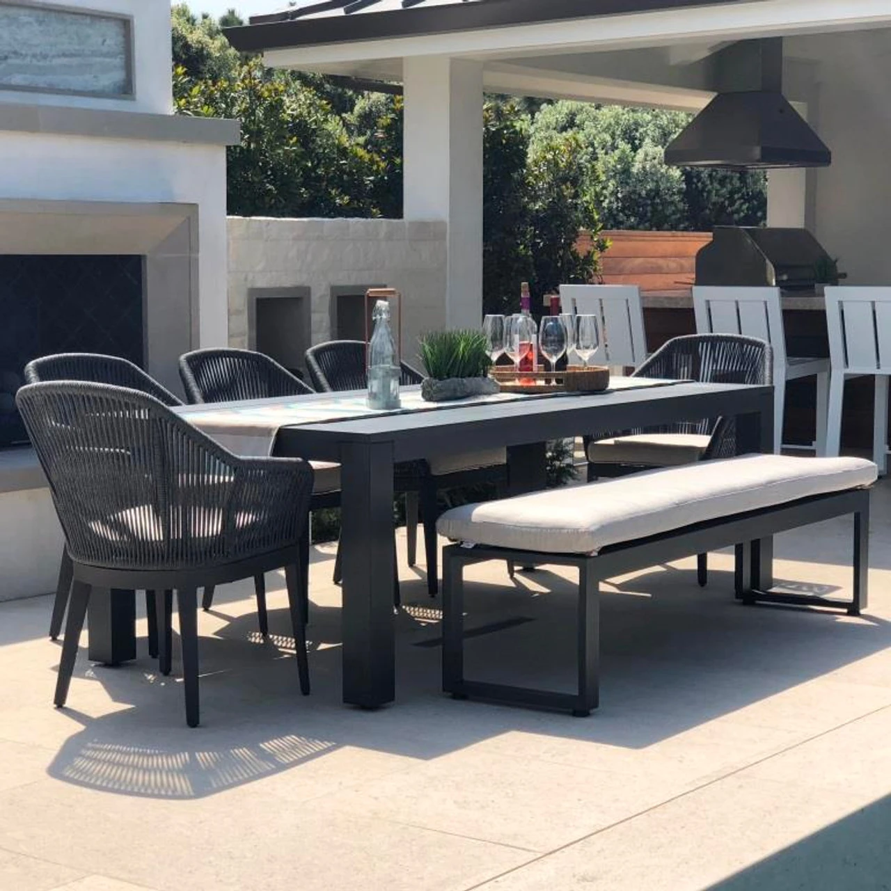 Sunset West’s Milano/Redondo Dining Set includes the following: (1) Redondo 90″ Rectangular Dining Table, (5) Milano Dining Chairs & (1) Redondo Dining Bench with Cushion all in the Slate Finish.