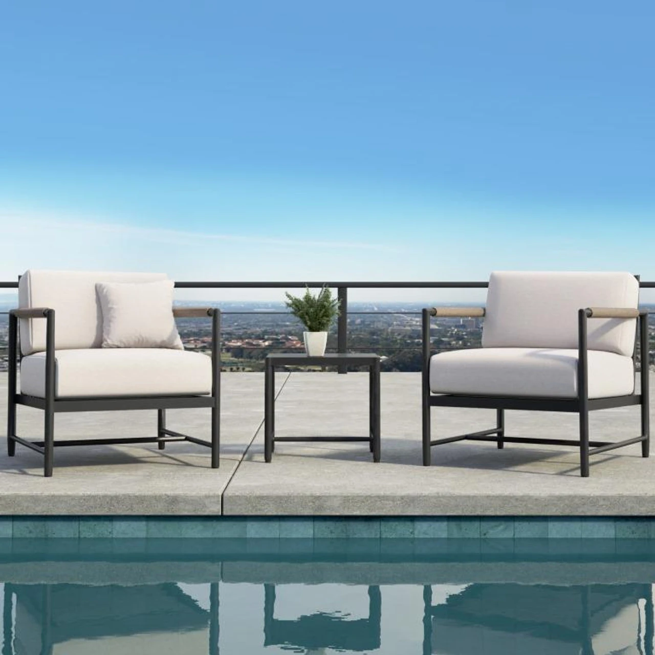 Sunset West’s Pietra Lounge Set Includes the Following: (2) Pietra Club Chairs & (1) Pietra Side Table. Cushions come stocked in Sunbrella Echo Ash but custom fabric may be ordered.