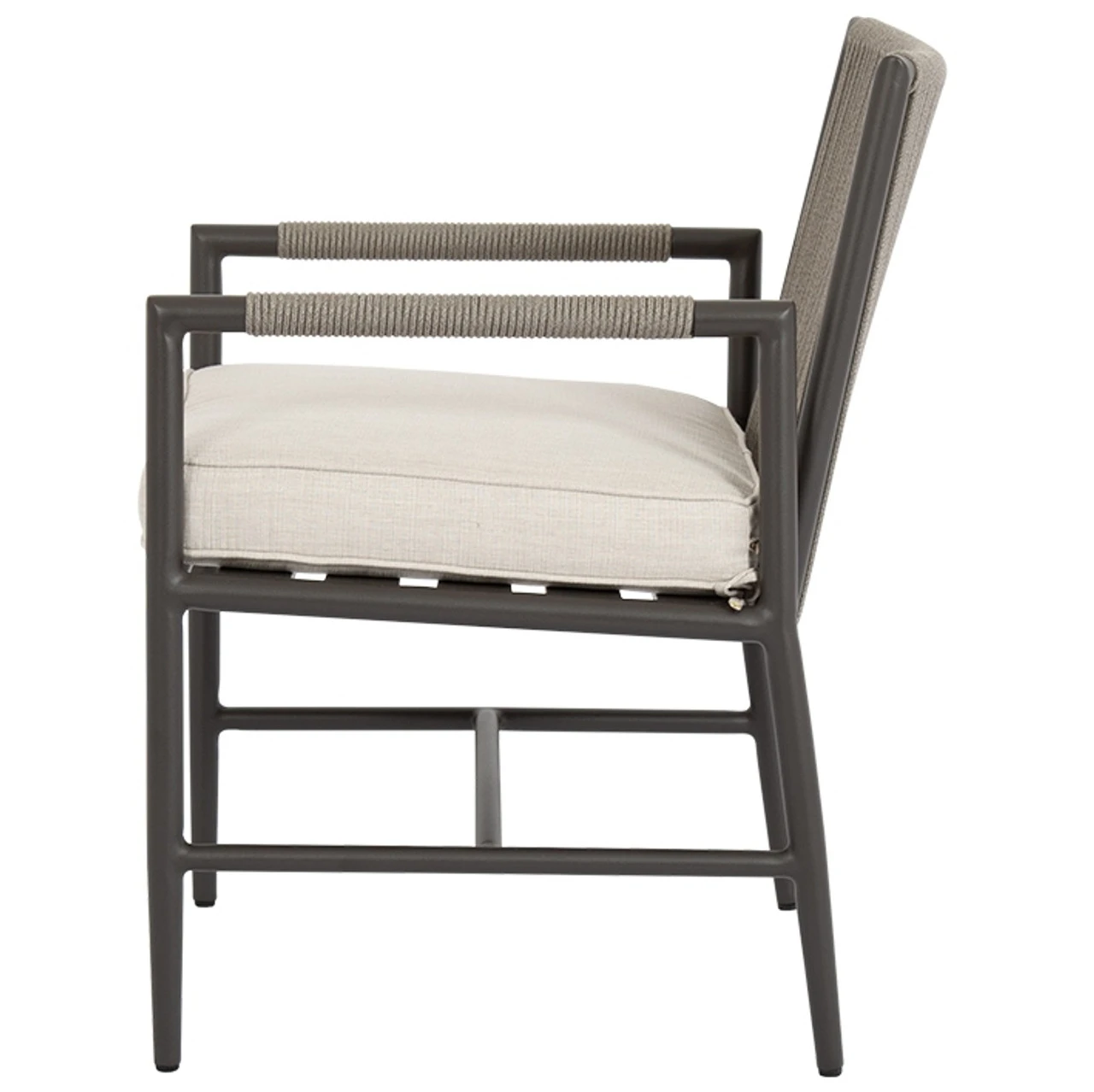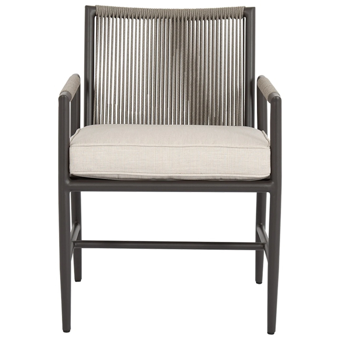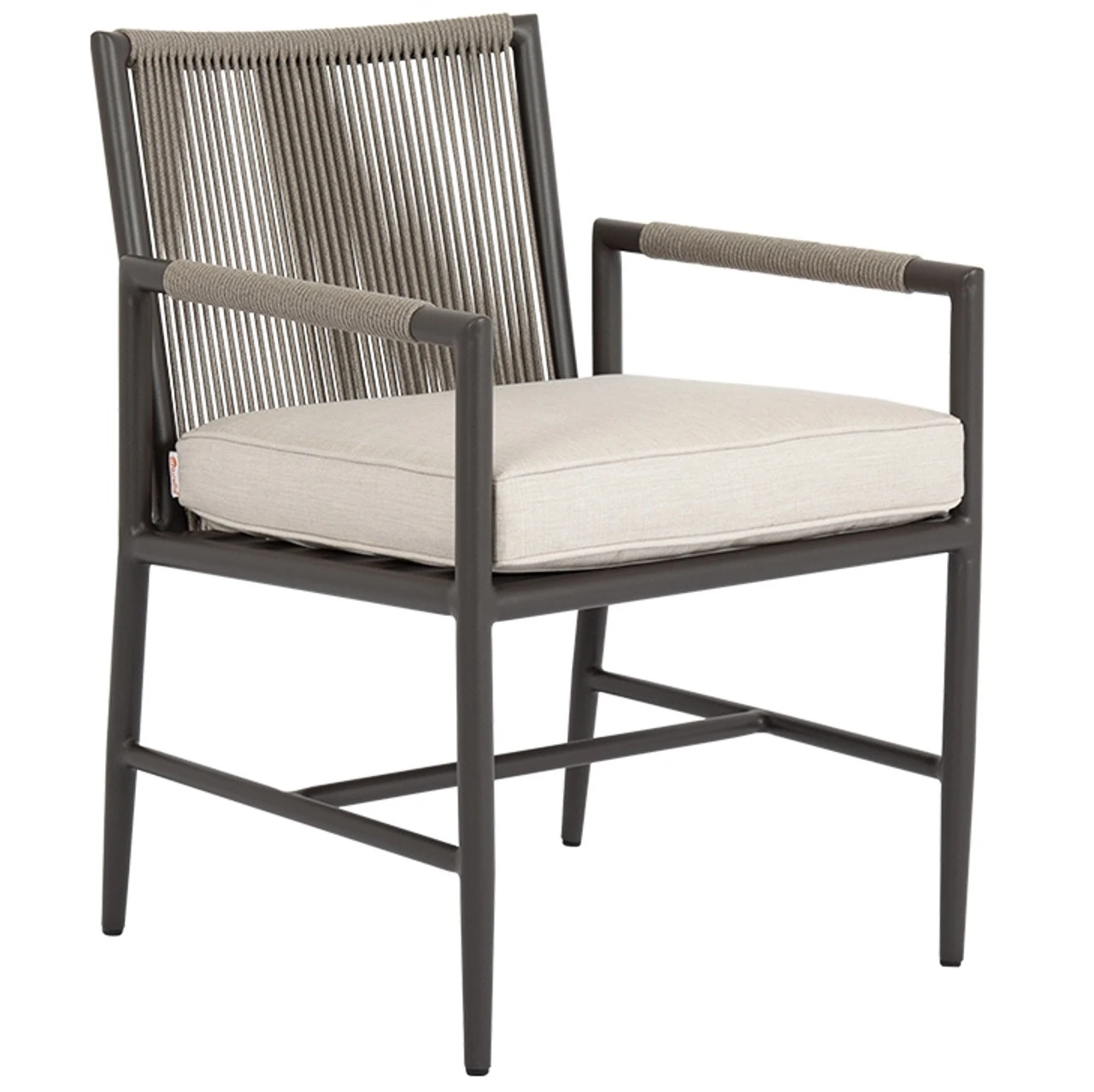 Sunset West’s Pietra Dining Armchair. Cushion comes stocked in Sunbrella Echo Ash but custom fabric may be ordered.