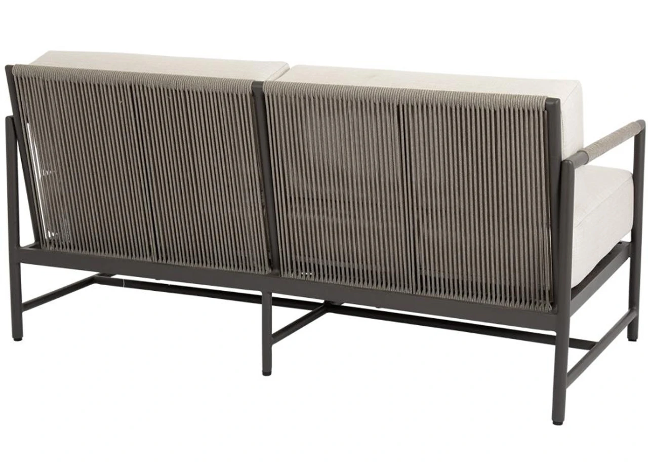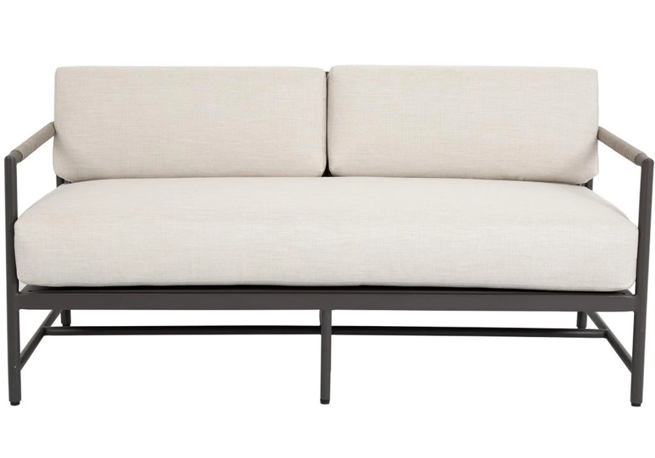 Sunset West’s Pietra Loveseat. Cushions come stocked in Sunbrella Echo Ash but custom fabric may be ordered.