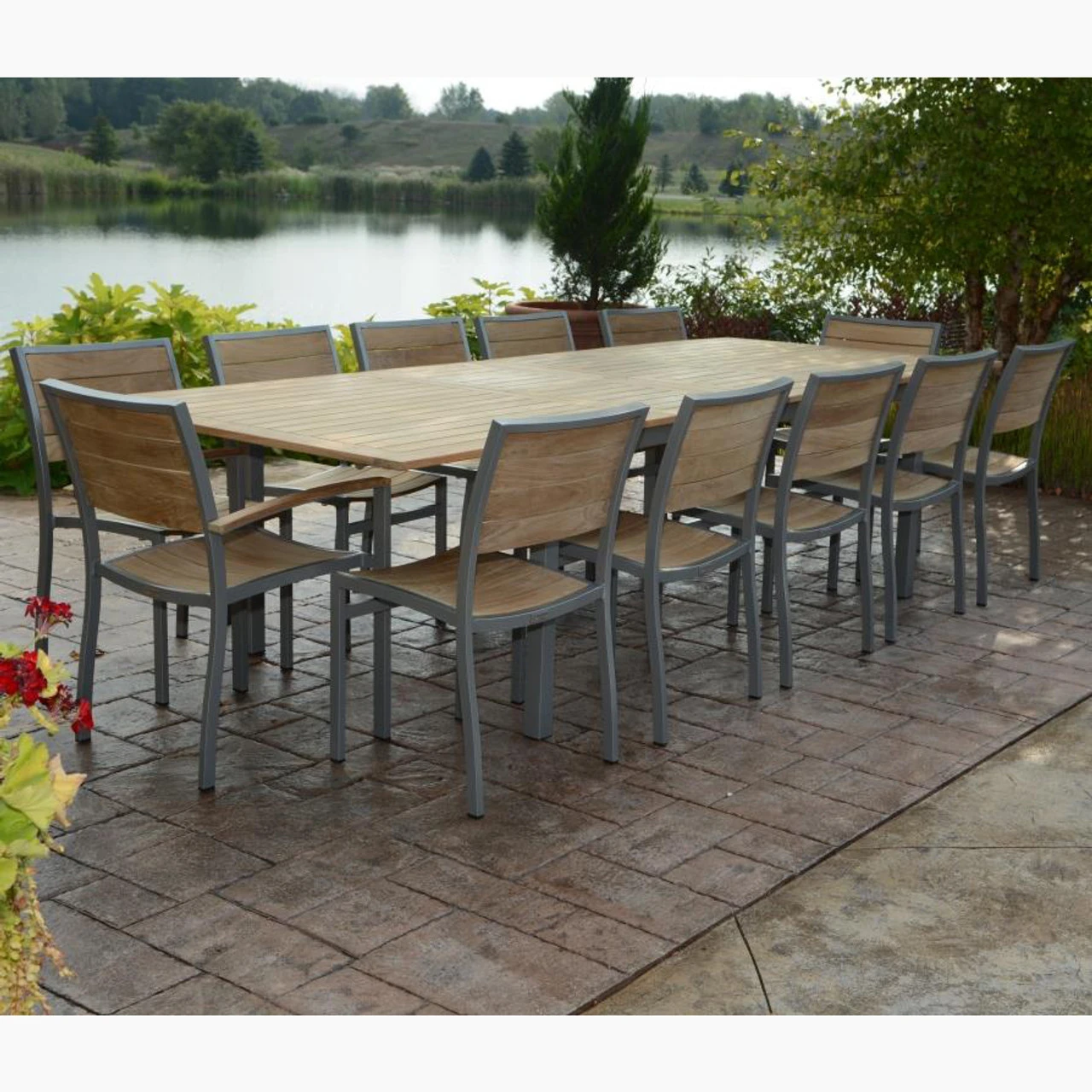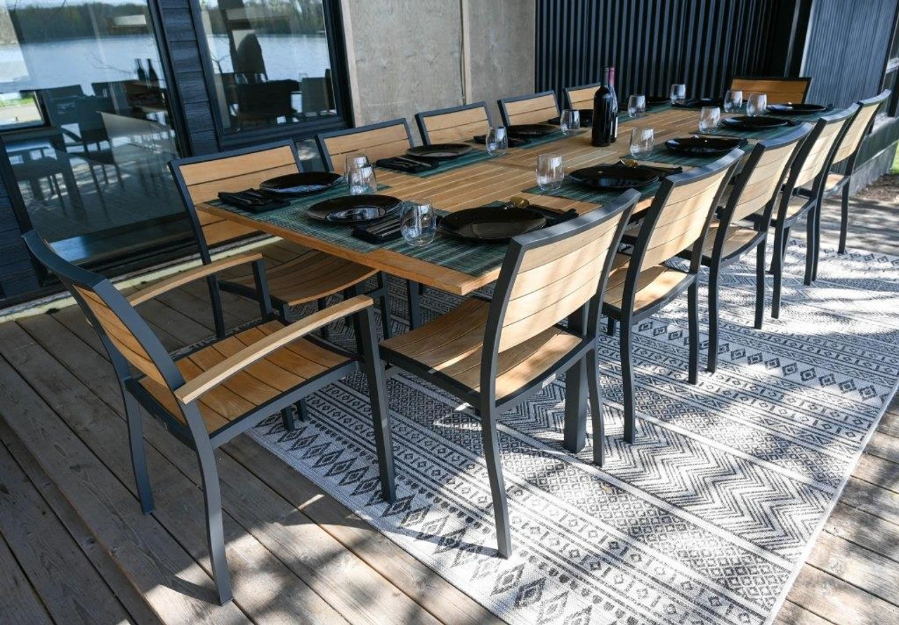 Accommodate large parties comfortably in your outdoor entertaining space with the Three Birds Casual SoHo Teak Extension Table Dining Set. The centerpiece of this quality teak outdoor dining set is the 115-inch long SoHo Teak Extension Table, an extra-long outdoor dining table that adjusts to three lengths up to 115 inches. The set includes twelve slatted teak chairs in your choice of white or silver frames, including two SoHo Arm Chairs and ten SoHo Side Chairs from Outdoor Furniture Plus. This large teak dining set is luxurious and stylish.