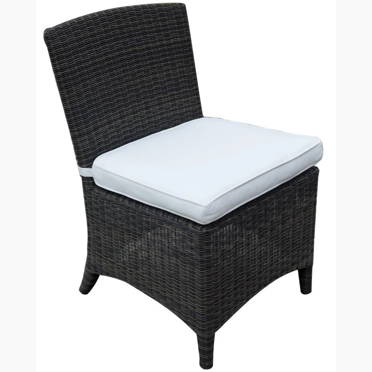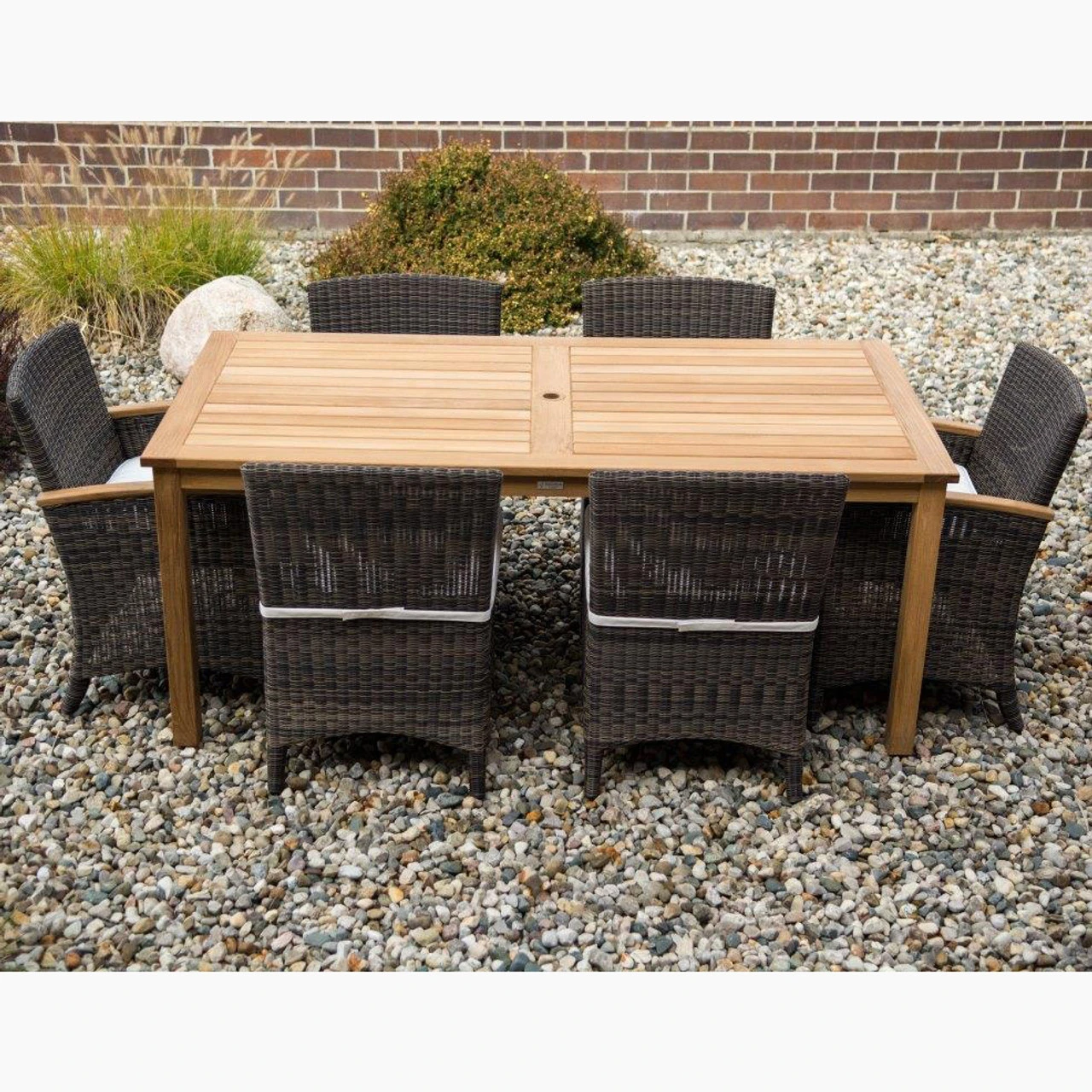 With the striking 72-inch long Brunswick Table at the center, the Three Birds Casual Brunswick Teak and Wicker Dining Set offers inimitable outdoor luxury. It comes with two Bella Arm Chairs and Four Bella Side Chairs made from sturdy resin wicker with an aluminum frame. The Brunswick teak dining table features an umbrella hole and plug so you can dine comfortably on sunny days. Outdoor Furniture Plus will ship the Brunswick dining set to your tastes with your choice of high-quality Sunbrella fabric cushions.