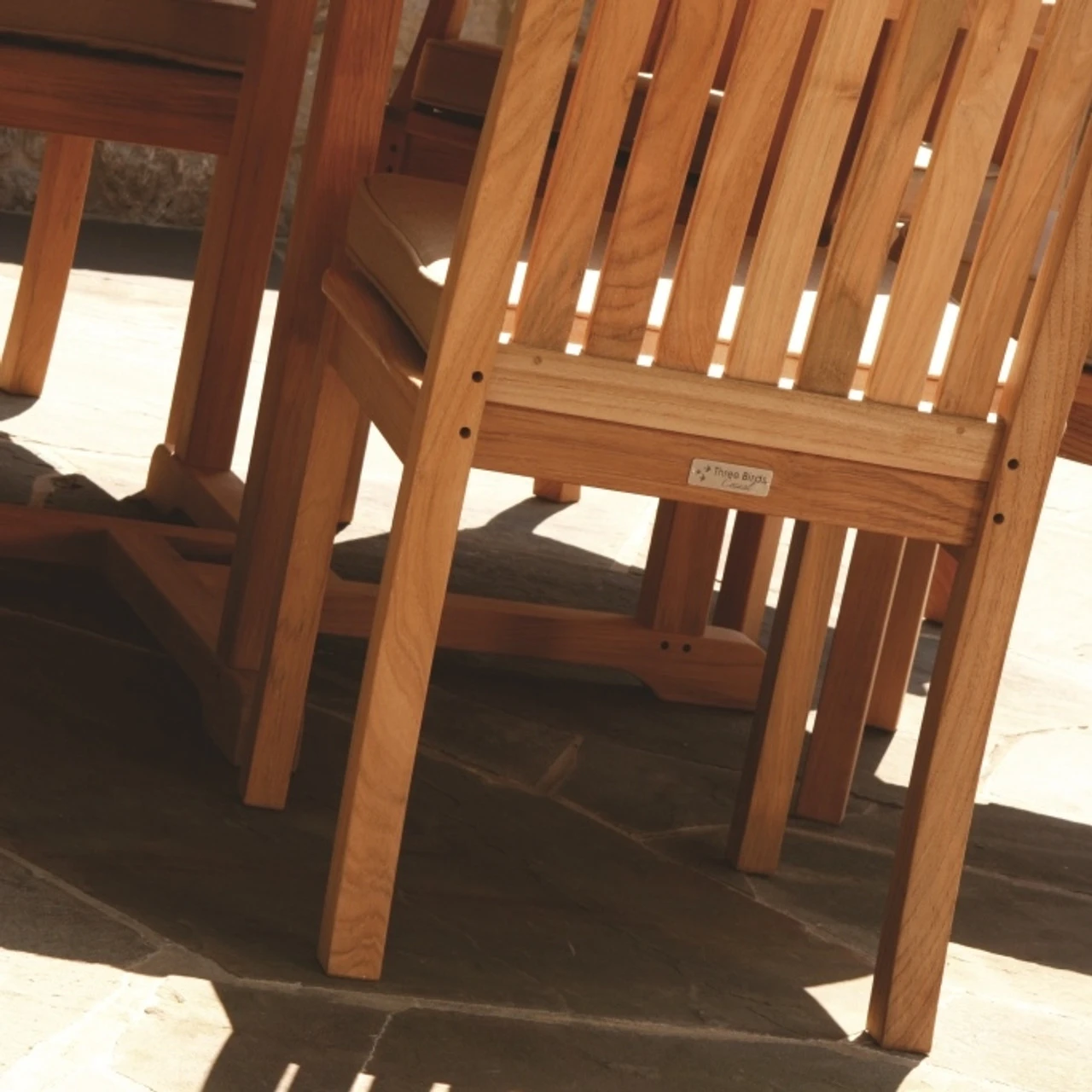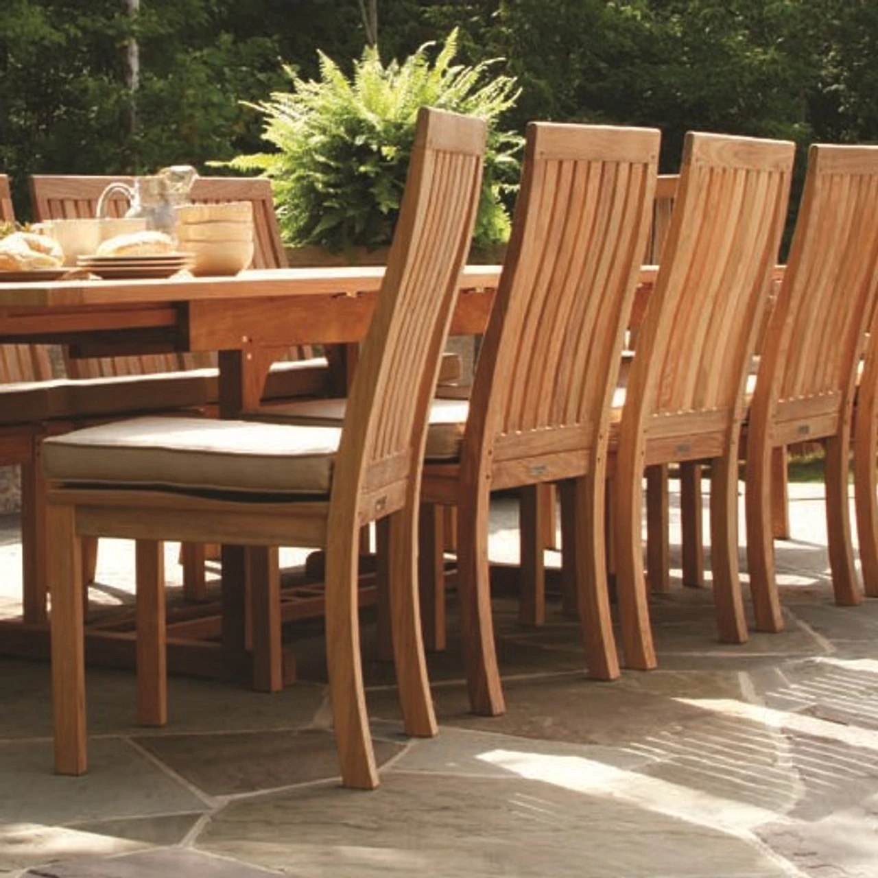 The Three Birds Casual Monterey Teak Dining Side Chair from Outdoor Furniture Plus will give you many seasons of use, thanks to its sturdy construction from grade A plantation-grown teak. Make it even more inviting with one of our optional comfy cushions available in a variety of colors. This chairs polished smooth finish means it will look great anywhere outside, whether you use it as a standalone chair or pair it with our Three Birds Brunswick Teak 36-Inch Square Dining Table. This chair also goes great with the Teak Armchair. This would make a great set for an outdoor dining table.