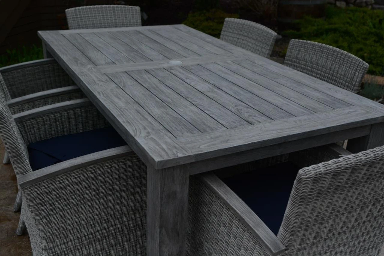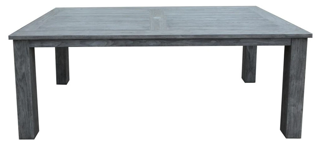 Your friends, family, and neighbors will love gathering around this chic patio table from Outdoor Furniture Plus. Crafted entirely of weather-resistant teak, it boasts a contemporary, Parsons-inspired look with clean lines and a unique, slatted surface for even more artistry. The gray tone of this Three Birds Shelburne table also enhances the beauty of teaks wood grain. With stainless steel hardware, easy assembly, and a subtle umbrella hole, this outdoor foundation piece makes relaxation and dining a breeze. Simply surround it with wicker dining chairs to finish your patio oasis.