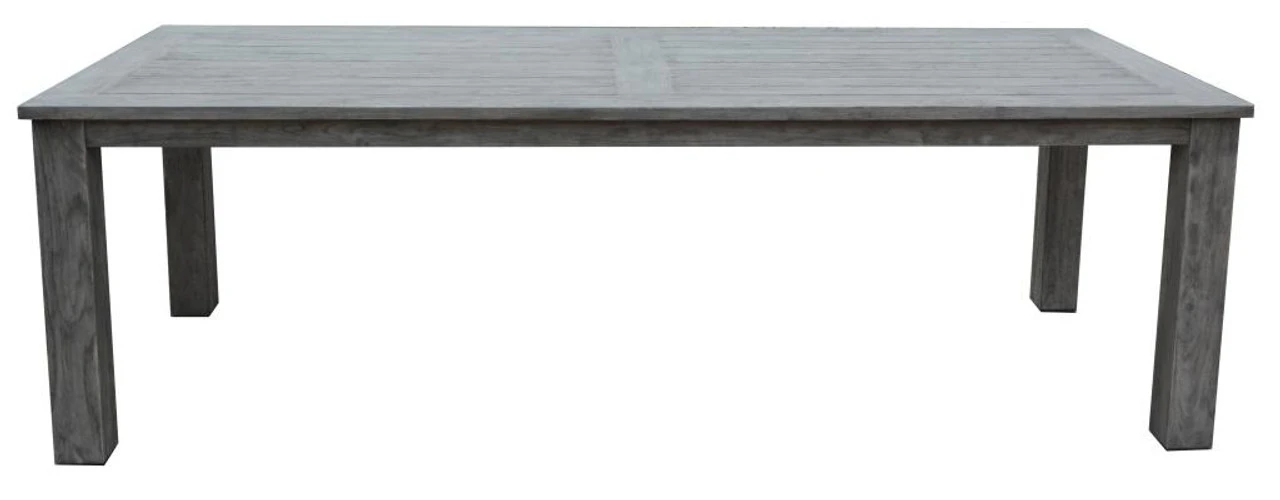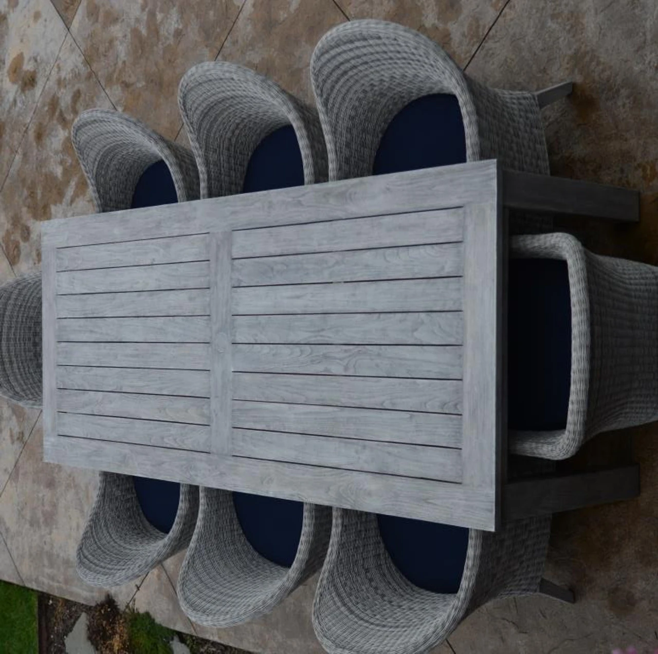 When its time for a patio party, theres no better table to create memories around than the Three Birds Shelburne gray teak outdoor dining table from Outdoor Furniture Plus. With its teak construction, stunning slatted top, easy assembly, and stainless steel hardware, this contemporary 96″ outdoor dining table provides a timeless look and long-lasting strength. Able to easily seat up to eight, it also offers the space for an umbrella on those sunny summer days when you need some extra shade. Combine with wicker dining chairs or dare to mix materials by surrounding it with metal chairs.