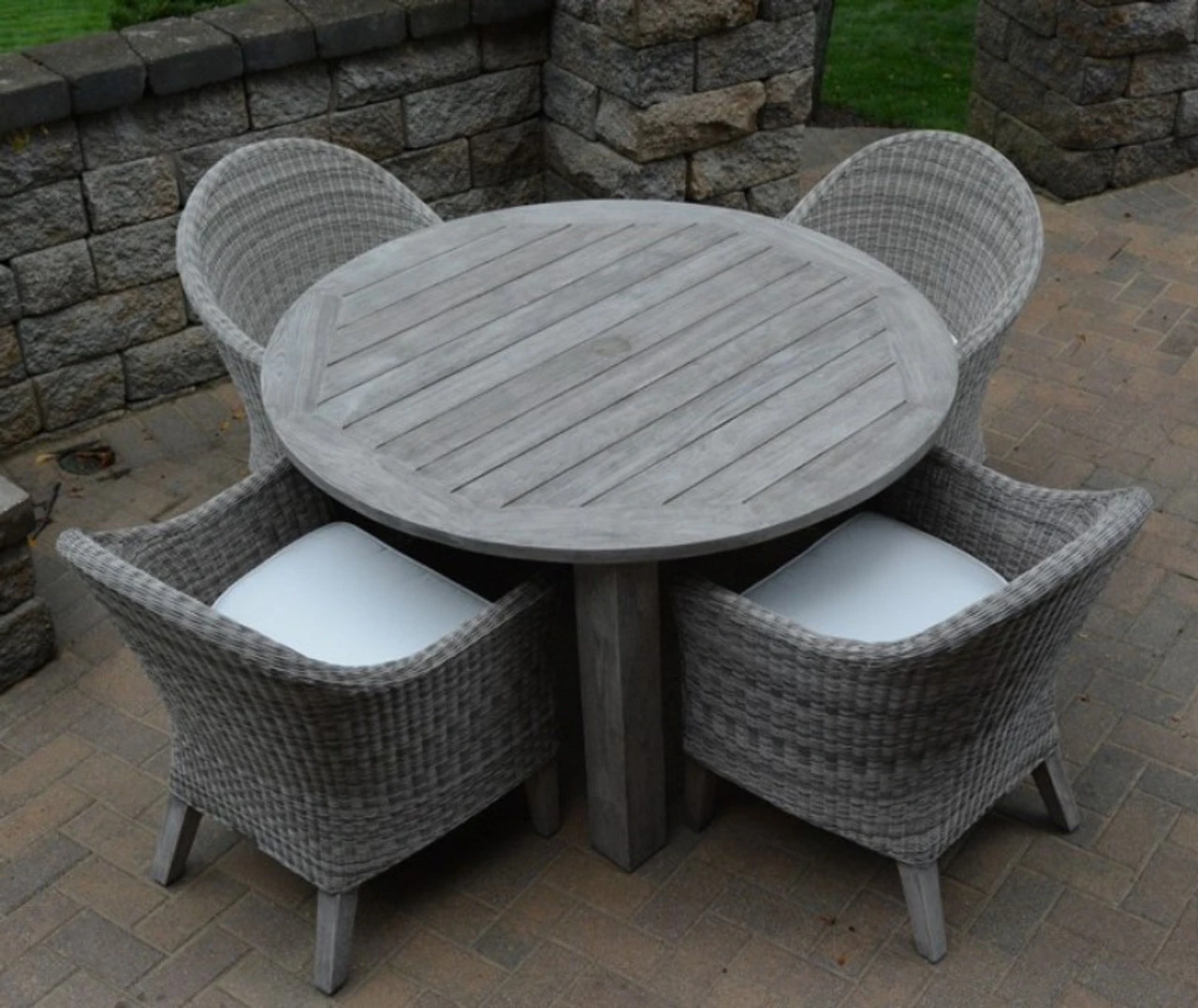 Create an intimate al fresco dining environment with the striking Three Birds Shelburne Teak and Viena Wicker 4-Seat Round Dining Set. This attractive five-piece outdoor dining set comes with a round teak dining table and four Vienna Dining Arm Chairs. The table is made from vintage-looking teak, while the chairs offer a hardy resin wicker and aluminum construction. When you shop Outdoor Furniture Plus, you can choose from multiple all-weather wicker and cushion colors to tailor the set to your tastes.