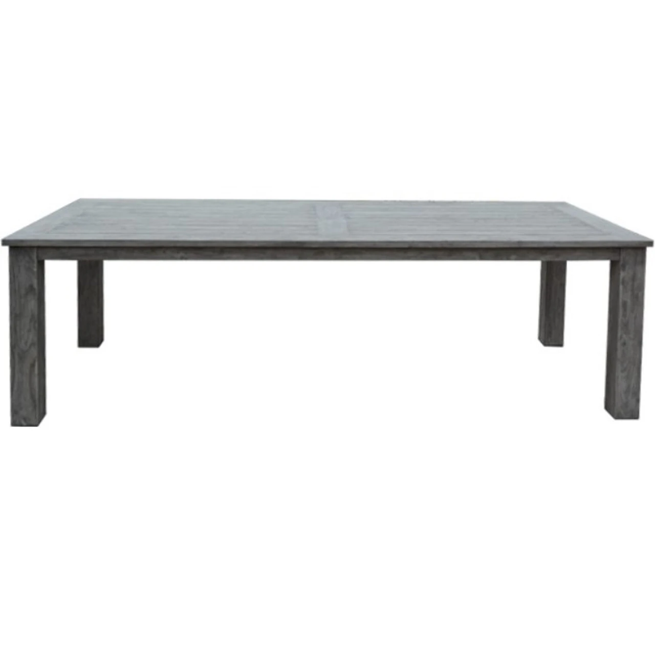 (Teak finish on table and chair arms will weather off as the teak ages to a natural gray color)