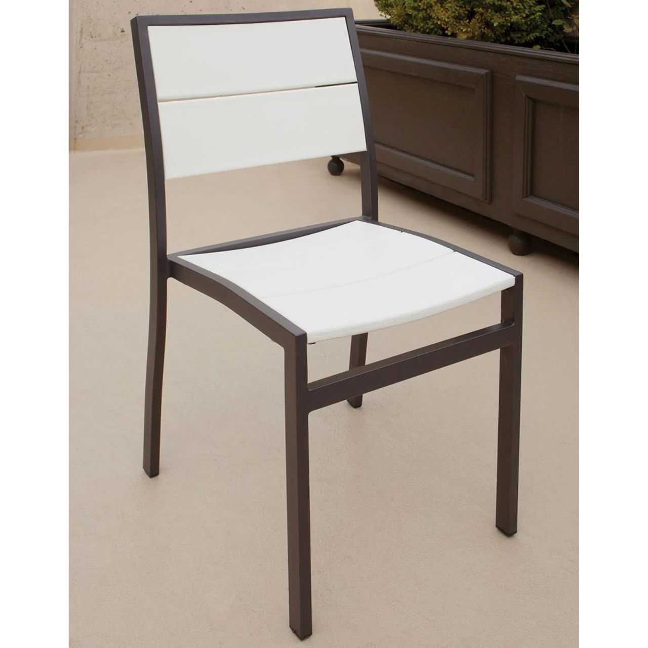 The contemporary style of this TREX® Surf City Seat and Bench Dining Set from Outdoor Furniture Plus works perfectly with its modern-style seating. Seating for the 36- by 73-inch table includes two side chairs, two arm chairs and a 68-inch bench. Seat cushions can be added in the color of your choice, and the two-tone furniture can be customized by color as well. Aluminum and polyethylene are used to create a durable, weather-resistant set.