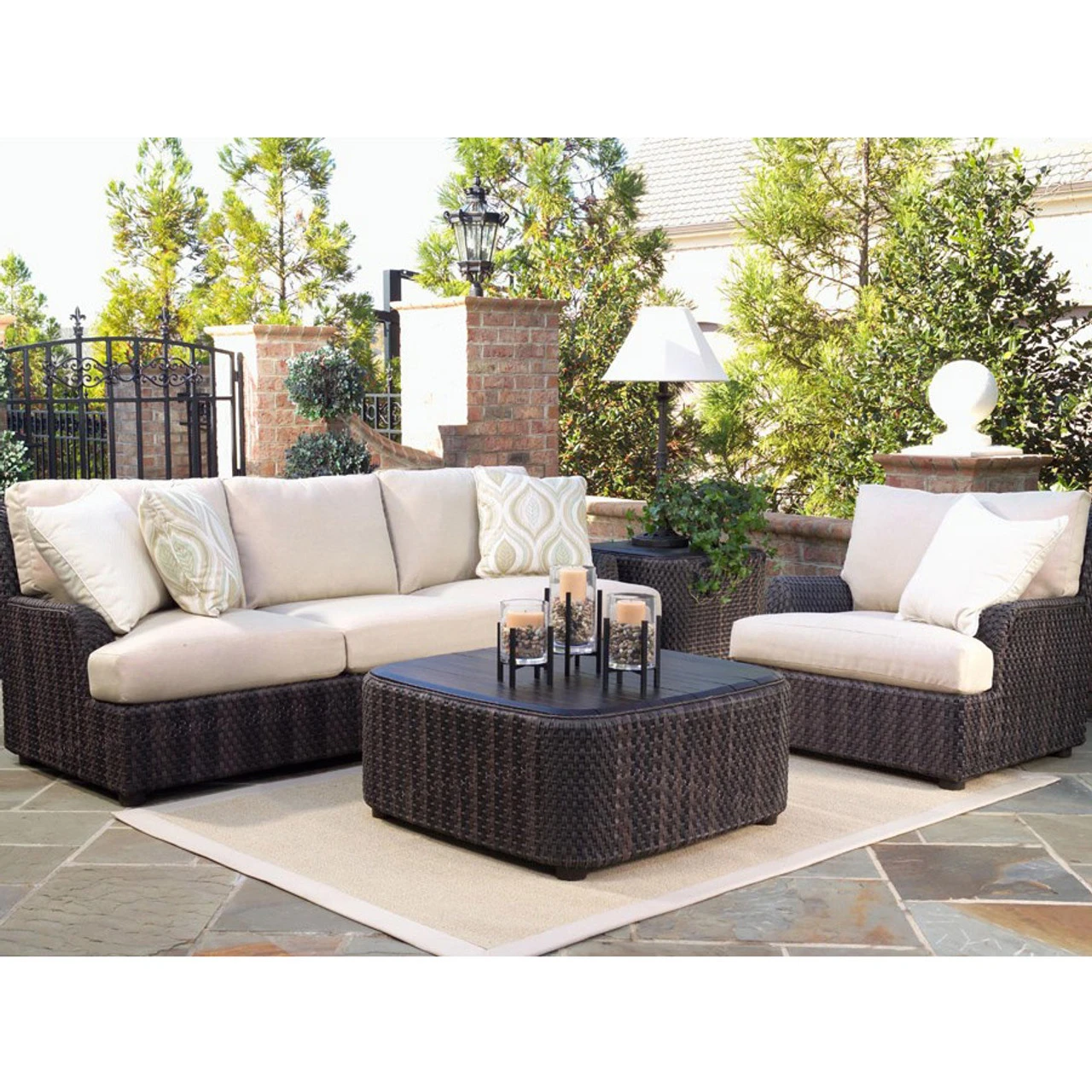 Furnish your patio in one easy step with the Whitecraft by Woodard Aruba Seating Set from Outdoor Furniture Plus. This complete set comes with a sofa and lounge chair that creates ample seating for your family or guests, and their deep-seated shapes are very comfortable and relaxing. Powder-coated aluminum frames and woven wicker coverings make these pieces truly durable, while the cushions come in your choice of custom colors to match the set to the rest of your dcor. This Aruba set also includes an end table and coffee table with teak tops for balancing food or drinks outdoors.