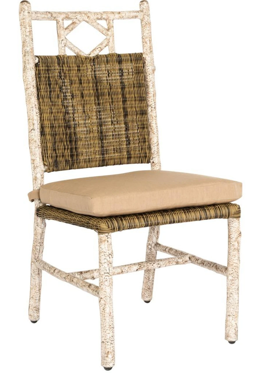 Complement your airy alfresco dining area with the striking River Run Wicker & Faux Bois Dining Side Chair. Built in the U.S., this Faux Bois dining chair features a high-quality powder-coated aluminum frame with a palm and birch weave finish. It can be ordered in your choice of Sunbrella fabric cushions to match your exterior design scheme. This option is shown in the rustic Tara Chocolate fabric (Sunbrella 01C) with Fife Park Welt (Sunbrella 20C). This chair is also sold as part of several complete patio dining sets in the River Run Collection from Outdoor Furniture Plus.