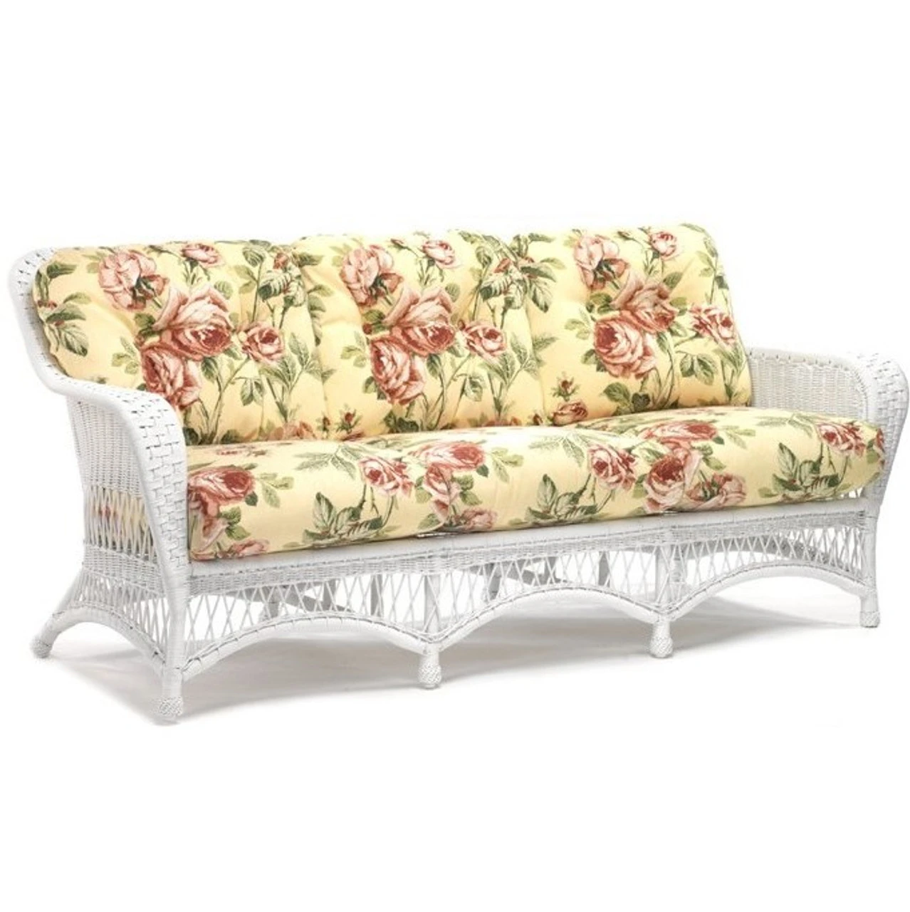 Our All Weather Wicker Sommerwind Sofa – Available in Pristine White Weave, Natural/Round or Chocolate. Shown in unavailable fabric.