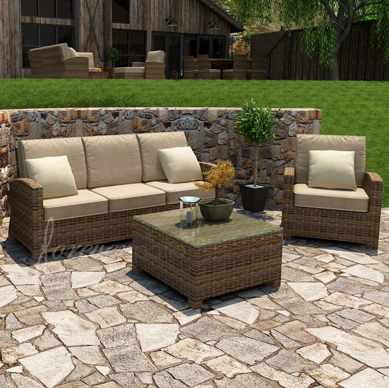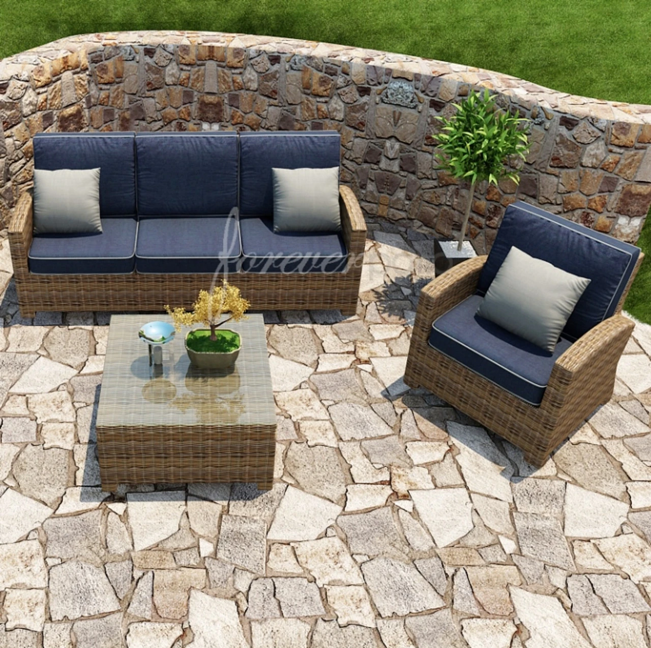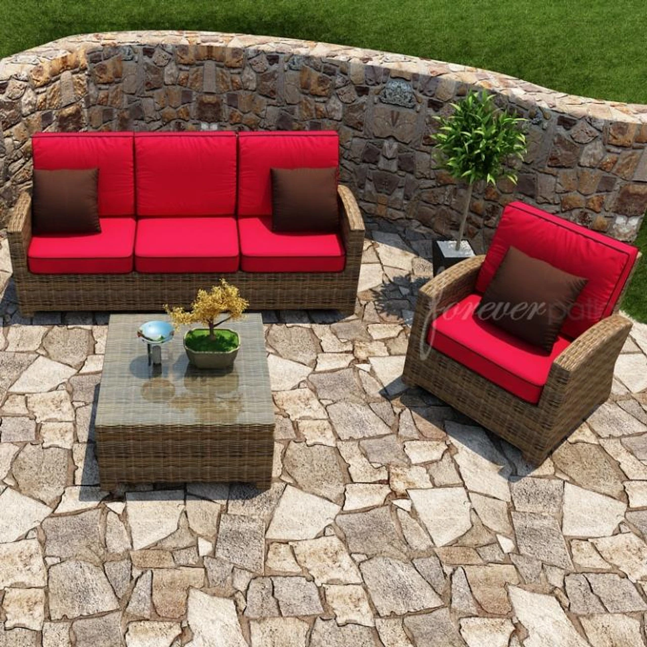 Relish the comfort of 6-inch-thick plush cushions and the good looks of contemporary wicker patio furniture design with a three-piece Forever Patio Cypress wicker sofa seating set. This Forever Patio Wicker Cypress Collection sofa set from Outdoor Furniture Plus includes a three-seat sofa, Cypress club chair with arms and a glass-top wicker coffee table. The wicker and cushion fabrics have been treated to be UV resistant and weather resistant. The sturdy powder-coated aluminum frames each carry a seven-year limited manufacturer’s warranty. Choose the fabric and wicker finish to complement your home’s dcor and unique sense of style.