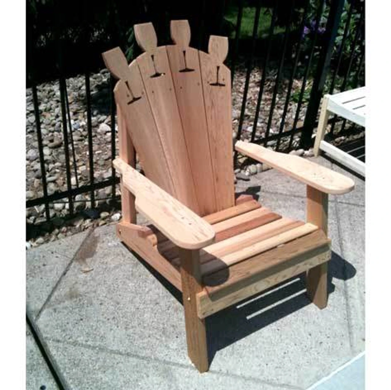 Perfect for wine enthusiasts, the Wine Glass Cedar Adirondack Chair from Outdoor Furniture Plus puts the fun in functional. Four wineglass-shaped cedar extensions at the top of the chairs back will let everyone know that youre an oenophile too. Western red cedar construction ensures plenty of sitting and sipping, backed by a three-year manufacturers warranty. Pair this outdoor wine chair with our Red Cedar End Table.