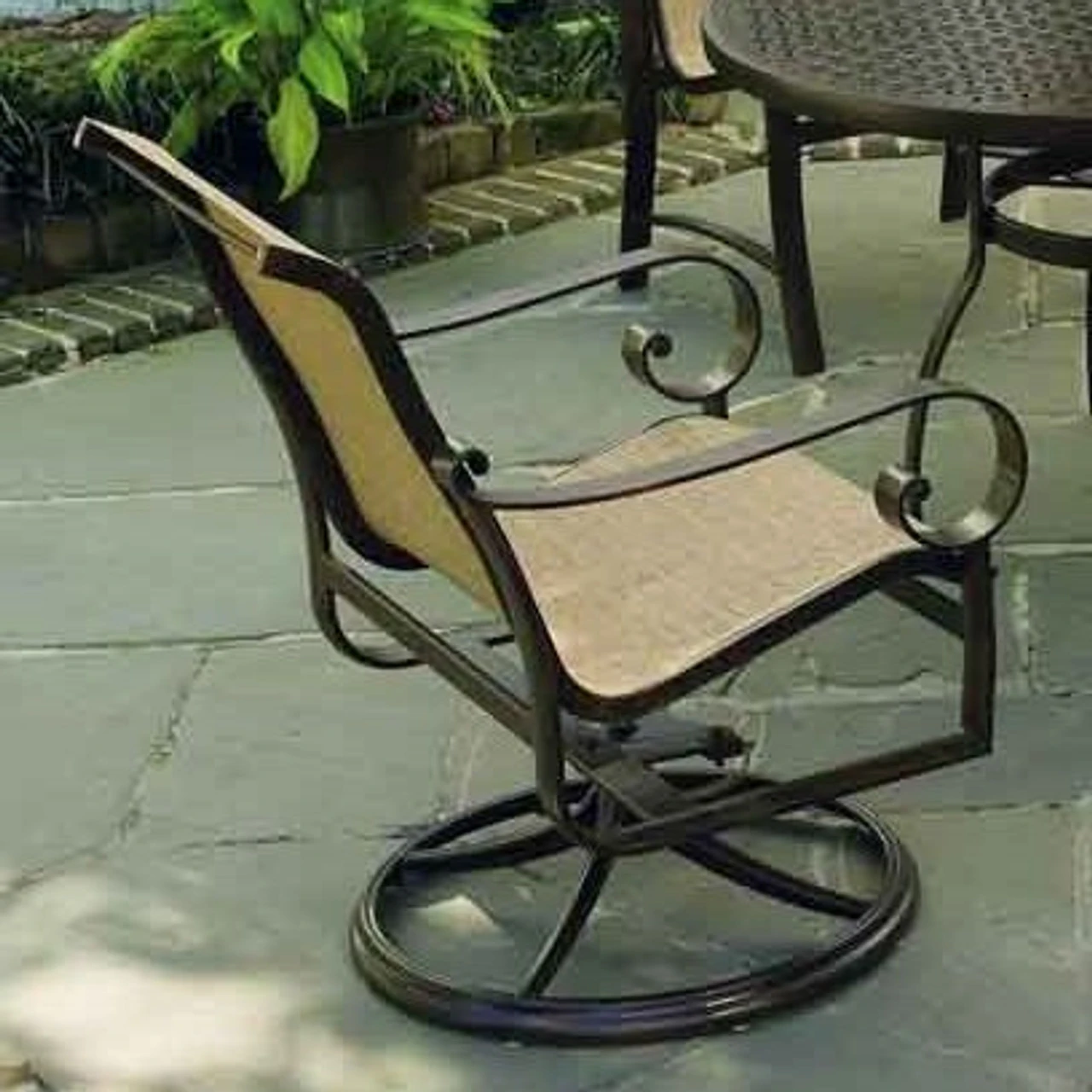 From curling armrests to its geometric back design, the Woodard Aluminum Belden Sling Swivel Rocking Dining Arm Chair is full of sophisticated details. It’s engineered with a versatile aluminum frame that’s strong yet lightweight, so you can easily rearrange your outdoor space. Plus, this patio armchair from Outdoor Furniture Plus lets you take it easy in a supportive sling design. Rotate around, rock back and forth, or just sit and eat with friends. Pick from several fantastic finishes and dozens of sling fabric options. Add the right dining table and you’ll be sitting pretty!