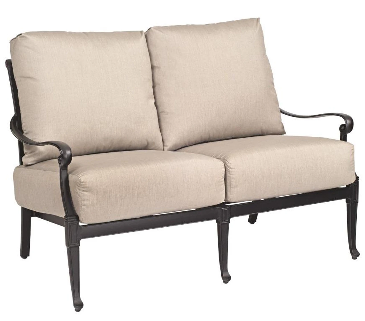 It may look like something out of a vintage English study, but our Woodard Aluminum Wiltshire Loveseat is sophisticated outdoor chic at its finest. Featuring a powder-coated aluminum frame, this piece of furniture is built to withstand the test of time. Yes, even in the sun and rain. It boasts curved arms, an elegant design on its open back, and thousands of possible finish and cushion design combinations. This seat from Outdoor Furniture Plus is also exceptionally comfortable. Perfect for time spent with friends and family outside!
