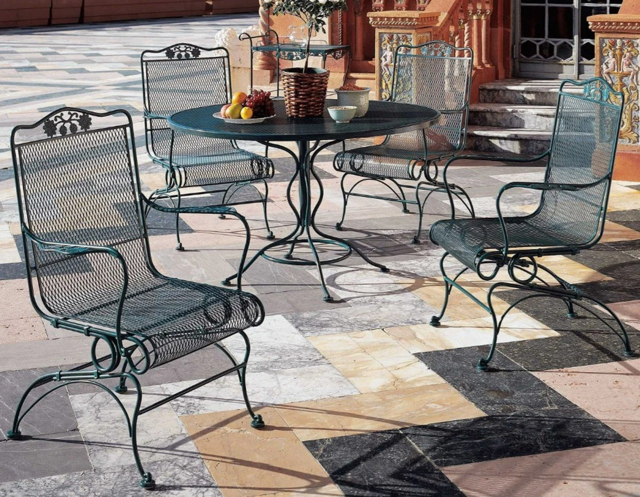 Woodard Briarwood Dining Set Includes:Â (4) High Back Coil Spring Dining Chairs & (1) 48″ Wide Mesh Top Umbrella Table